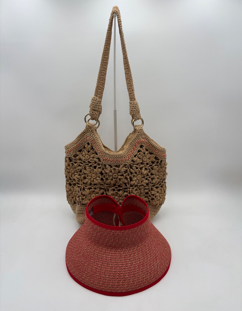 Two very useful beachy-feeling pieces of attire. From Sun 'n' Sand comes an adjustable red & natural woven sun hat that collapses down for packing into a small space. Closes with a Velcro strip and is in excellent condition. One size will comfortably fit the largest or the smallest head with the adjustment. Great summertime woven purse/bag from The Sak. All kinds of floral patterns and weaves in natural shade with a glitter of sparkle behind the open weave (the backing fabric looks a bit like golden alligator skin!). Sturdy straps with metal rings and a fully lined interior with multiple pockets & zip top make this a great piece to carry everything you need in one place. Measures 12" W x 13" H with a 15" drop from the top of the straps to the center top of the bag. In great condition except for a couple of red marks on the interior/edge along the top - see last photo.