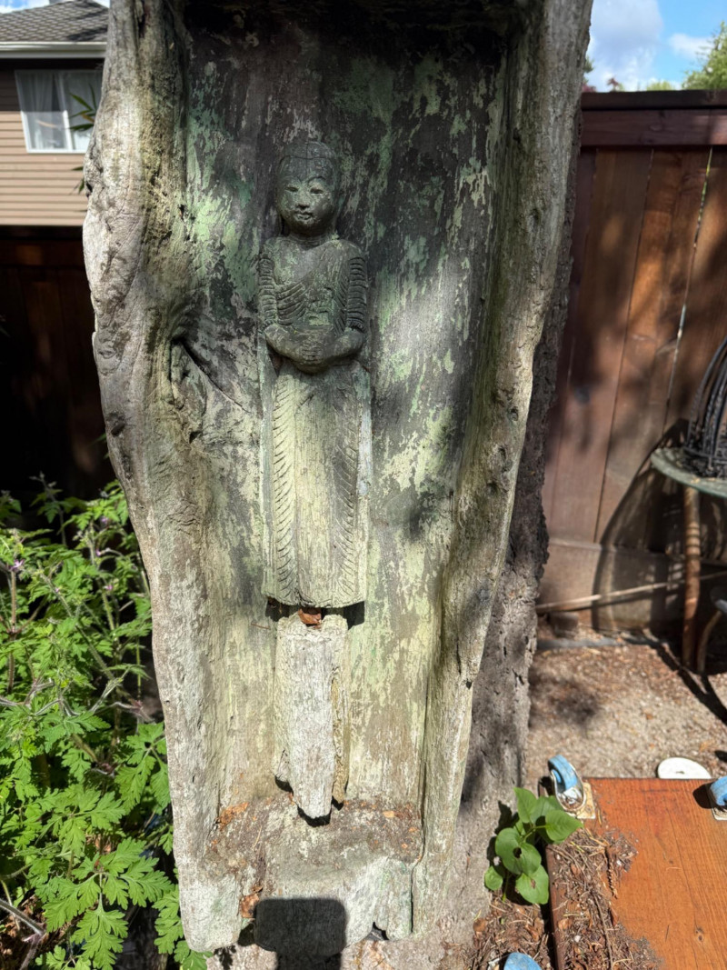 Hand carved wood statue. Dimensions are 34in tall, 11in wide, 6in deep