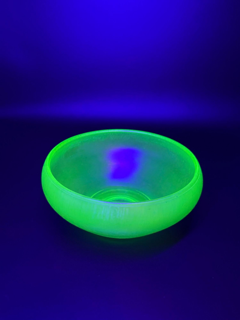 Green glass bowl with subtle iridescence and a slightly rounded base. Measures approximately 8 inches in diameter and 4 inches tall. The bowl fluoresces under UV light, indicating uranium content.