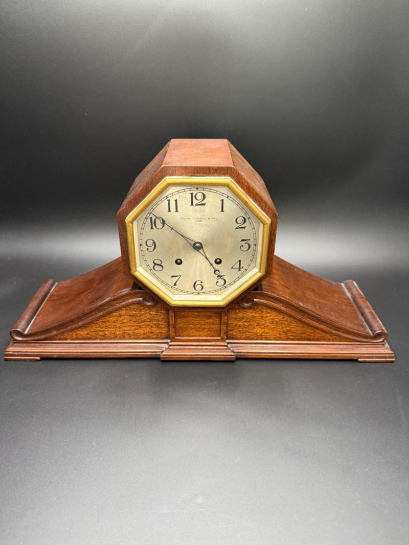 Seth Thomas Wooden Mantle Clock Seth Thomas wooden mantle clock with octagonal face, brass bezel, and mechanical movement. Service label dated 1987. Note: Functionality untested.