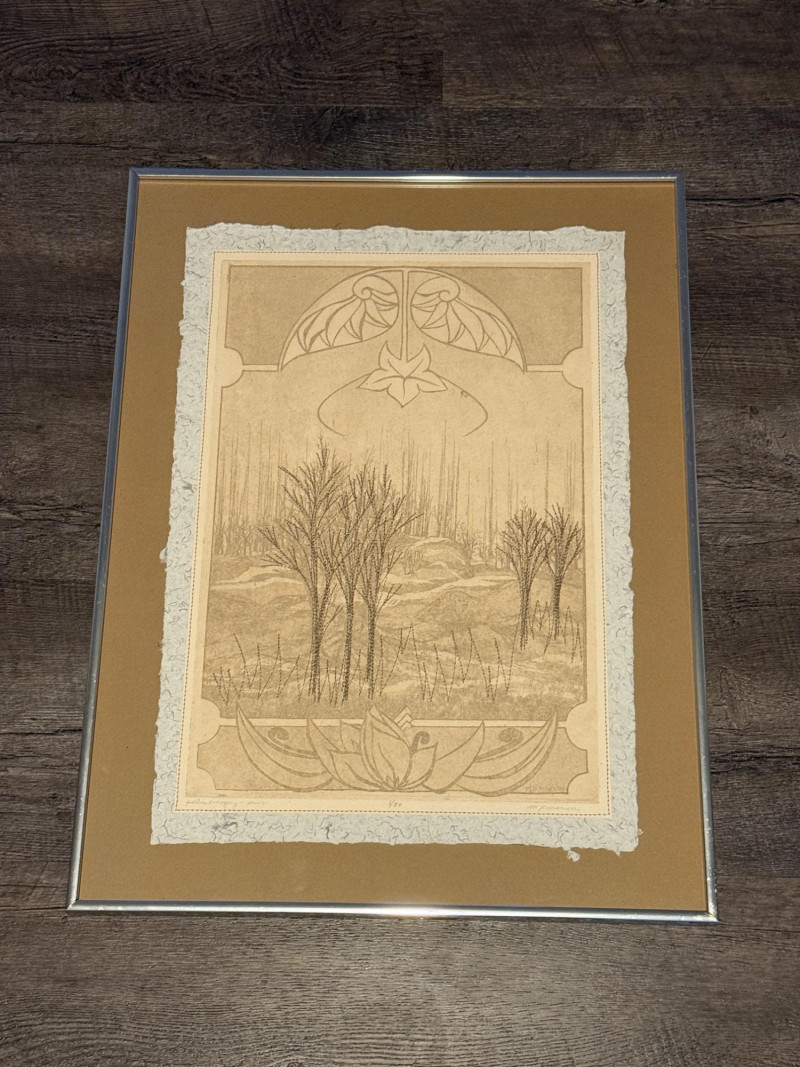 "Poetic Imagery – Sewn" by M.P. Marion This extraordinary etching by M.P. Marion, titled “Poetic Imagery – Sewn,” offers a contemplative view of a Wisconsin winter landscape, rendered with precision and poetic restraint. Stylized barren trees rise from gentle hills in fine, stitched-like linework—an intentional technique that evokes the feeling of both thread and ink, blending textile sensibility with natural observation. Framed within geometric Art Nouveau-style borders, the composition merges organic forms with architectural structure, drawing the viewer into a quiet narrative of place and pattern. The print is beautifully executed on handmade blue jean denim paper, adding rare material depth and textural richness. Hand-signed by the artist, M.P. Marion Limited edition: Numbered 1/50 – the very first in the series Professionally matted and framed for preservation and display This piece is a true collector's gem—melding regional artistry, unique material, and limited availability into one refined and soulful work. A special addition to any fine print, textile-inspired, or Midwestern art collection.