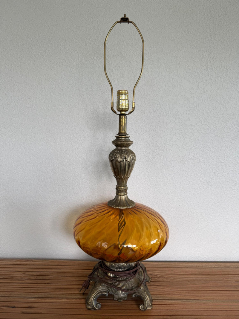 Vintage Amber Glass Lamp with Ornate Base – Working Condition A stunning example of mid-century lighting design, this vintage amber glass table lamp features a wide, rounded swirl glass body in a rich golden hue. The base and neck showcase intricate cast metal detailing with elegant scrollwork and a timeworn patina that adds to its antique charm. The glass glows warmly when lit, creating a cozy retro ambiance that brings a touch of 1960s–70s glamour to any room. The lamp stands on four ornate feet and is topped with a brass harp ready for your preferred shade (not included). Lamp is in working condition. Approximate Measurements: Height (to top of harp): 32" Width (at widest point): 11"