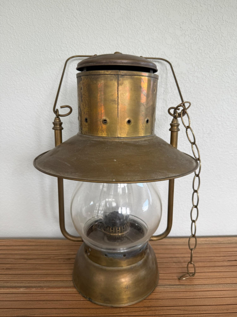 Brass Kerosene Lantern Metal lantern with glass globe, wide brass shade, and carrying handle. Includes chain and hook. Burner and wick visible inside. Measurements: 20 x 13.5 cm