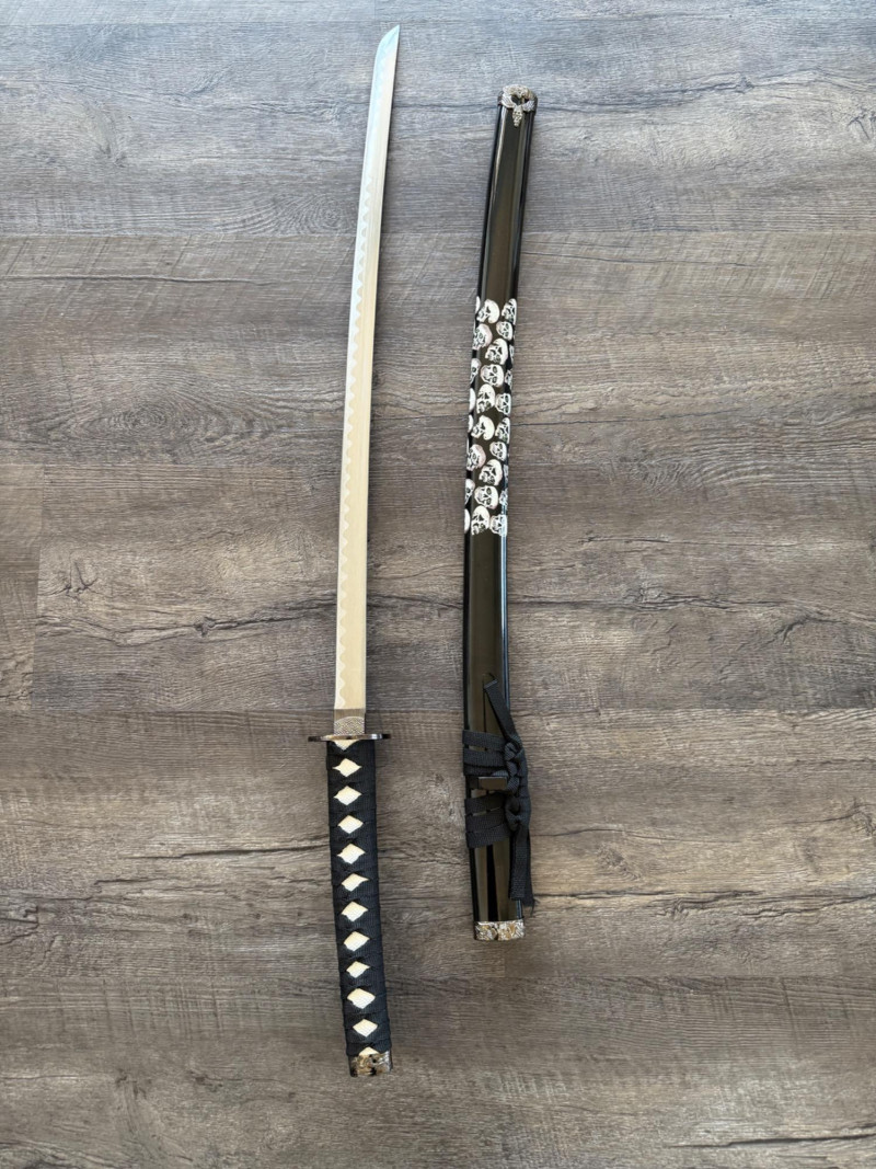 Black Katana with Skull Detailing Katana with black handle and white diamond-patterned wrap. The handguard is circular with a metal mesh pattern. The blade is polished steel with a wavy hamon pattern. The scabbard is black lacquered with white skull designs concentrated at the upper section. The scabbard has a black cord wrap and matching metal fittings at both ends. Measurements: 40 inches