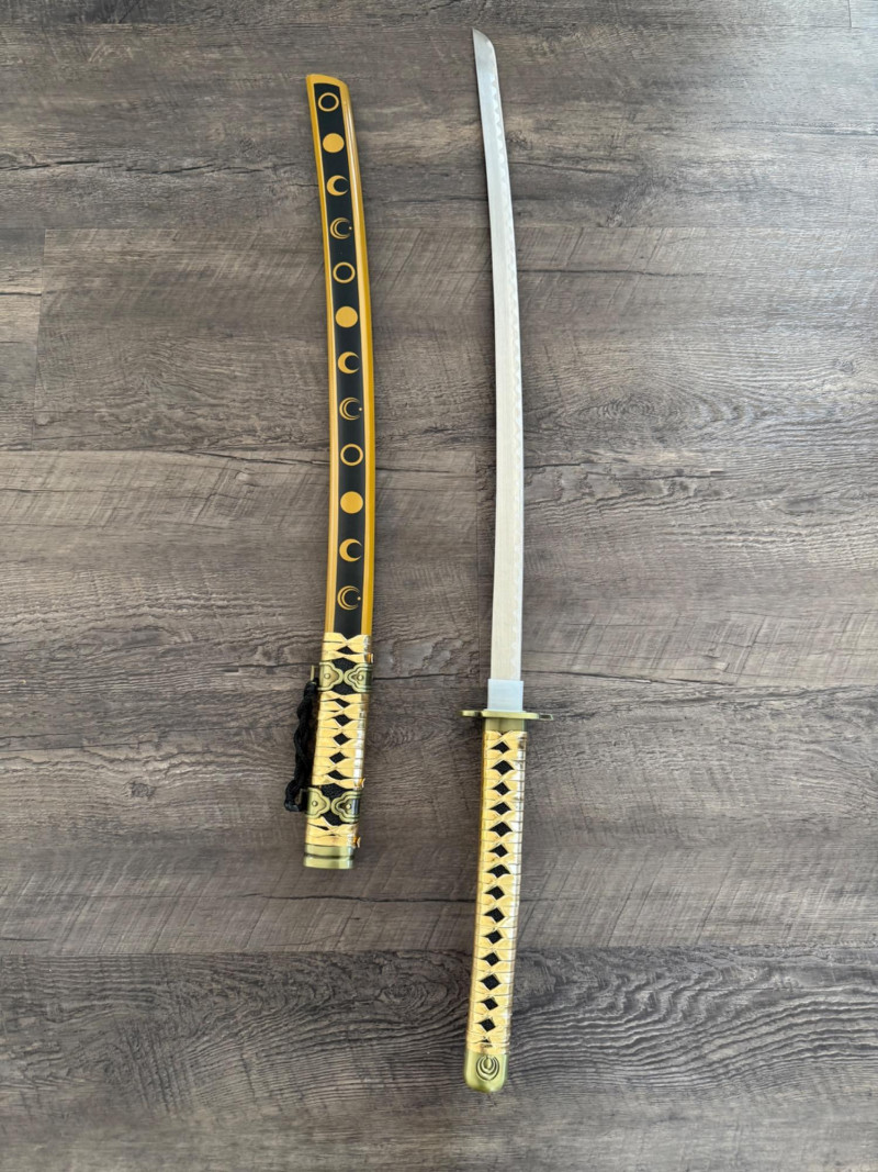 Black and Gold Katana with Crescent Design Katana with a black scabbard featuring gold crescent moons. The handle is wrapped in gold pleather with black diamond openings and molded fittings. Includes a black cord on the scabbard and a curved blade with a wave-style hamon. Materials used include gold pleather, polyurethane, and vegan leather. Measurements: