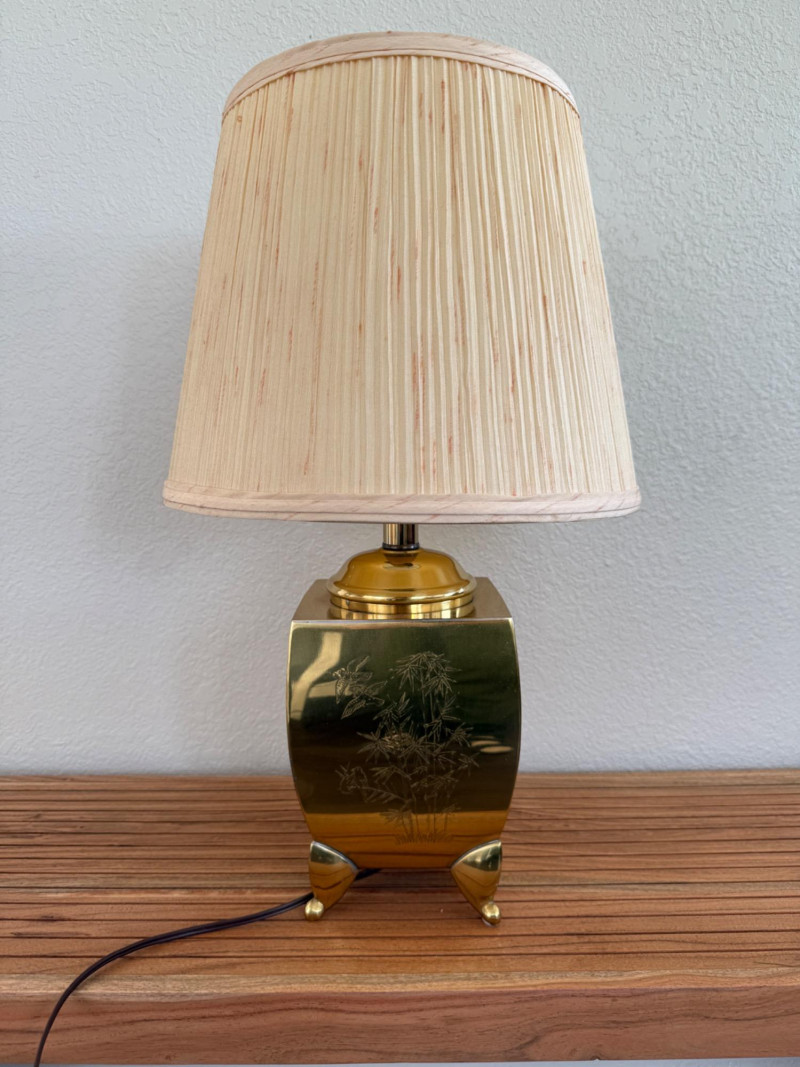 Engraved Brass Table Lamp with Bamboo Shade Table lamp with a rectangular brass body standing on four triangular feet. Each side of the base is etched with different botanical scenes including bamboo, lotus flowers, and pine trees. The lamp includes a vertically ribbed bamboo-style shade. It has a standard two-prong plug and internal socket with harp support. Measurements: 13" W x 22" H