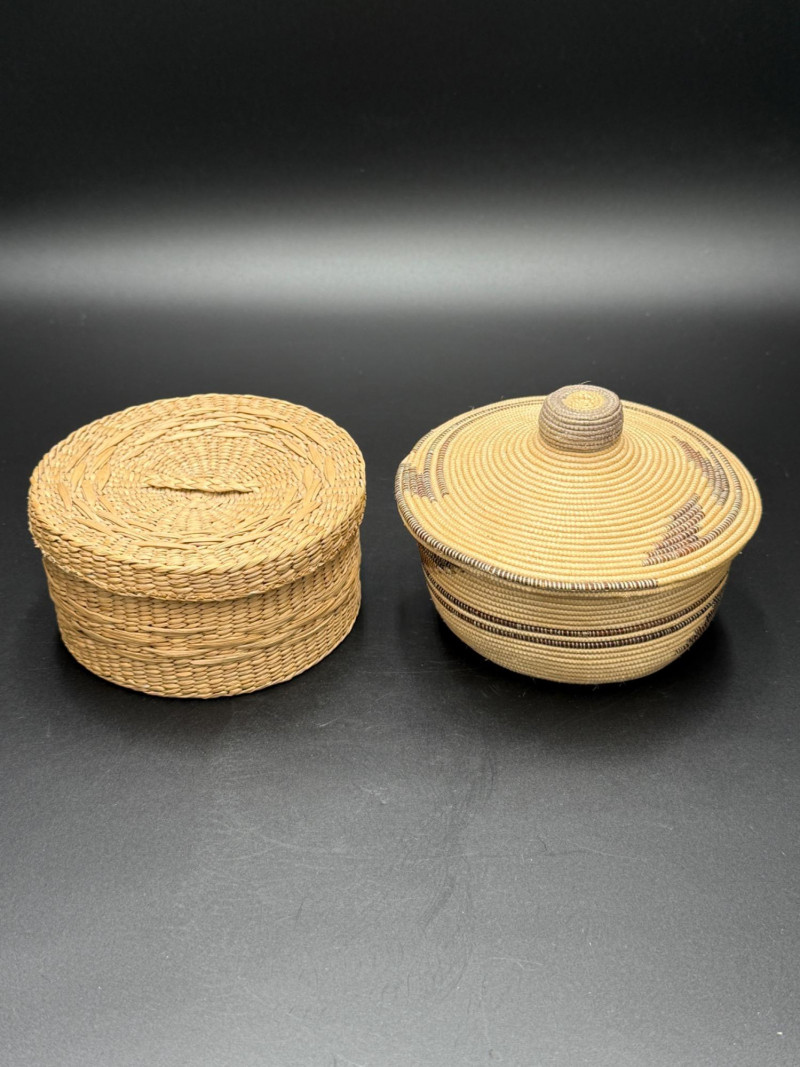 Two woven baskets with fitted lids. One has a coiled construction with geometric dark patterning and knobbed lid. The other has a plaited flat weave with matching cover. Both are circular in shape and differ in height and weaving style.