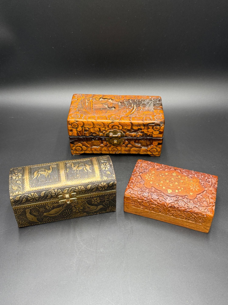 Mini Carved and Etched Boxes (Set of 3) Set of three small decorative boxes in different styles and materials: Carved Wooden Box (4 x 8 x 4 in) Gold-Tone Camel Box (4 x 7 x 3 in) Floral Inlay Wood Box (4 x 6 x 2 in)