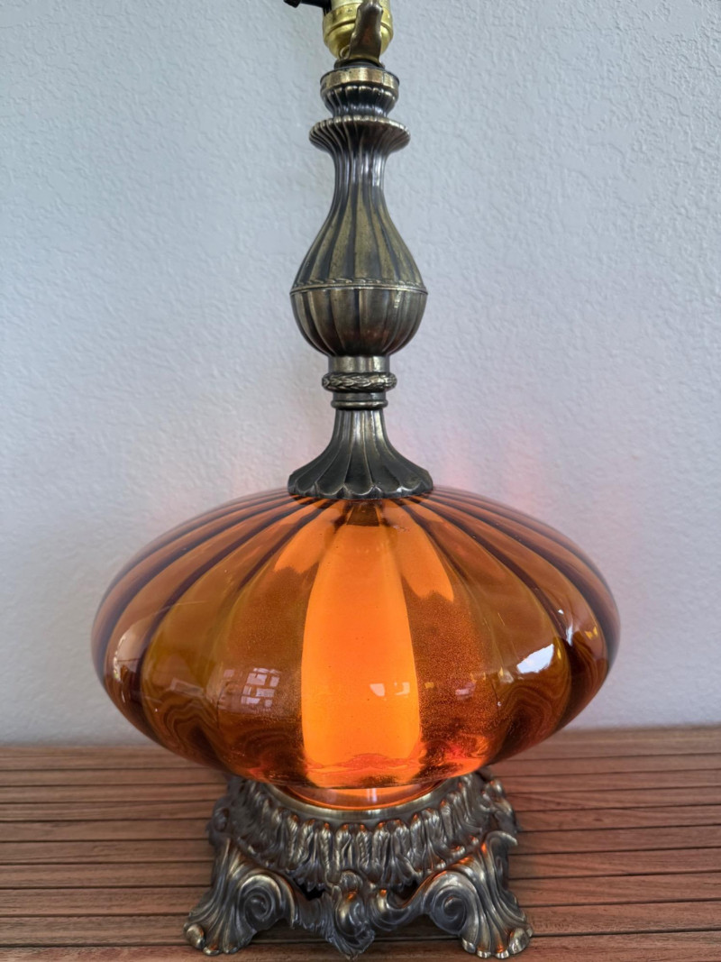 Mid-century amber glass table lamp with a fluted, bulbous base on an ornate metal stand and column. Includes a working top socket light and an internal base light for low illumination. The metal base and column feature scroll and leaf motifs. No harp is included.