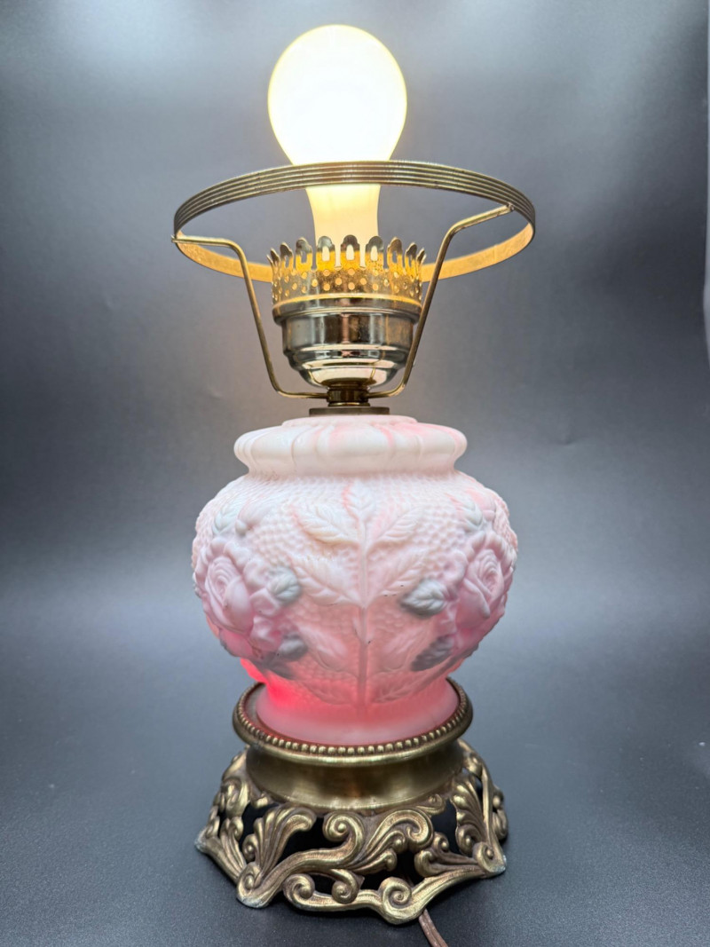 MCM Embossed Roses Glass Lamp Mid-century electric table lamp with embossed rose and leaf motifs on pink-tinged milk glass. The molded glass body sits on an ornate metal base with gold-tone finish. Fitted with a metal collar and harp (shade not included). Measurements: Note: Both parts of the lamp work.