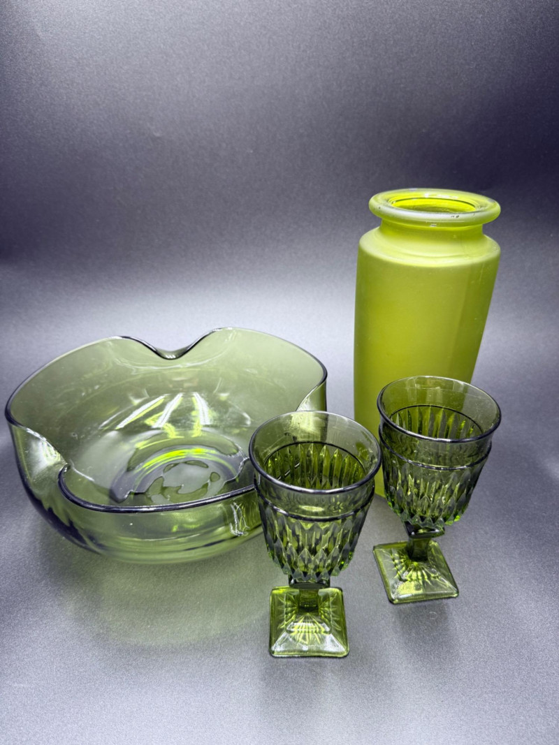 4-Piece Green Glass Set Four-piece green glass set including: One green glass bowl with tri-lobed rim and rounded base, likely Anchor Hocking. One tall green glass vase with frosted surface, cylindrical body, and flared rim. Two pressed glass goblets with faceted diamond pattern and square footed bases, likely Indiana Glass. Measurements: Bowl: 9" diameter x 4" height Vase: 9" height x 4" width Goblets: 5.5" height each