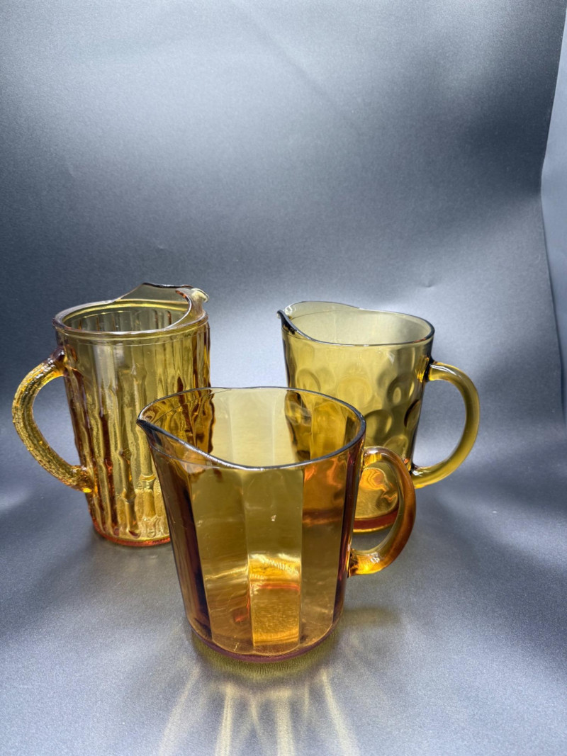 Vintage Amber Glass Pitchers – Set of 3 Set of three vintage amber glass pitchers, each with a distinct molded design: One pitcher with raised dot pattern, also known as bubble or coin spot style. One pitcher with vertical ridges and textured handle, likely Anchor Hocking's “Tahiti” bamboo pattern. One pitcher with paneled sides and a square base. Heights are approximately 9.5", 8", and 7".