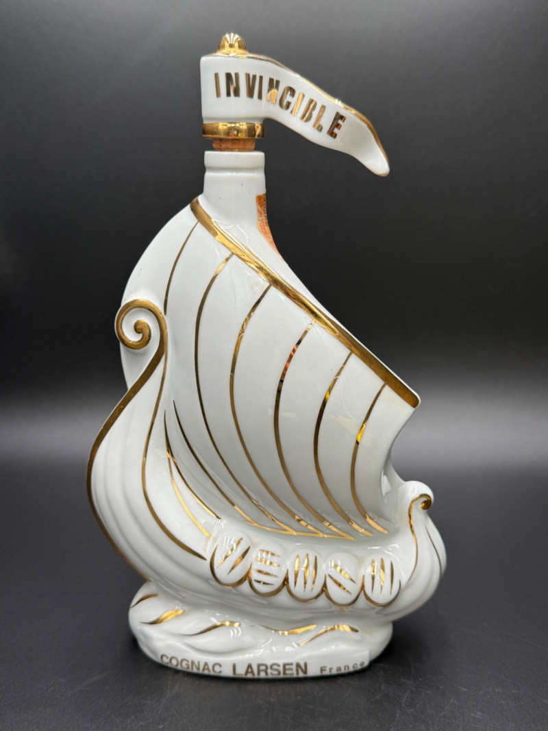 Porcelain Cognac Decanter – Larsen “Invincible” Porcelain decanter in the shape of a stylized Viking ship. The front features the word "INVINCIBLE” on the sail and "COGNAC LARSEN France" on the base. The surface is decorated with raised, wave-like patterns and gold trim. The stopper is shaped to resemble a flag and is also accented with gold. The underside is marked: Measurements: