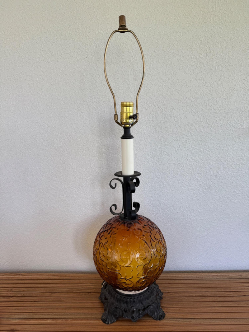Vintage 1970s Amber Glass Globe Table Lamp Vintage 1970s table lamp featuring a round amber glass globe with a raised scroll pattern. The lamp includes a dark metal base with ornate detailing, a vertical white stem, and black metal scrollwork supports. It has a brass socket, harp, and finial. Fitted with a two-prong plug and a fabric-wrapped cord. Dimensions: 30" tall x 8" wide. Note: Electrical wiring has not been tested on this item. Lamp kits can be found on Amazon for around $15.