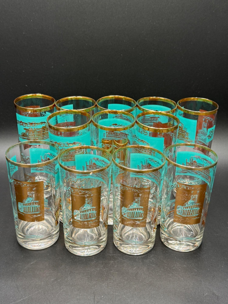 Libbey Riverboat Glass Set of 12 Set of twelve vintage Libbey drinking glasses with printed riverboat and architectural landmark scenes in turquoise and gold. The design wraps around each glass and includes stylized buildings, bridges, and steamboats, along with decorative scrollwork and floral elements. Each glass is trimmed with a gold band around the rim. Measurements: 8 tall glasses, each approximately 2.5 x 6.75 inches 4 small glasses, each approximately 3 x 5.5 inches