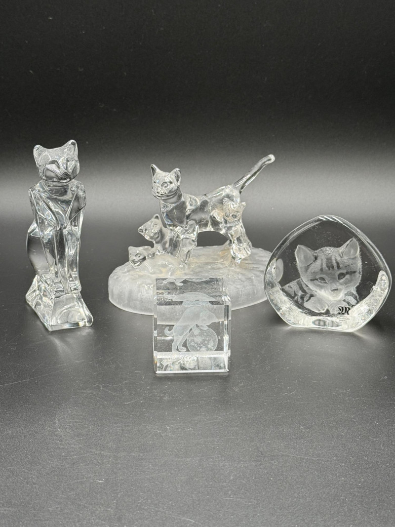 Crystal Glass Cat Figurines– 4 Pieces Seated Cat Figurine: Solid clear glass with defined facial features and upright pose. Mounted on a geometric base. Likely Cristal Durand, France. Cat and Kittens Group: A mother cat walking with three kittens on a frosted oval base. Molded in one piece with smooth surface detailing. Etched Cat Face Paperweight: Flat-bottomed with a rounded triangular front. Deeply etched cat face on the back surface. Marked "Mats Jonasson Sweden Full Lead Crystal." 3D Glass Cube with Cat: Rectangular glass block with a 3D laser-etched cat playing with a ball inside. Smooth beveled edges. Measurements: Approximately 2 to 4 inches