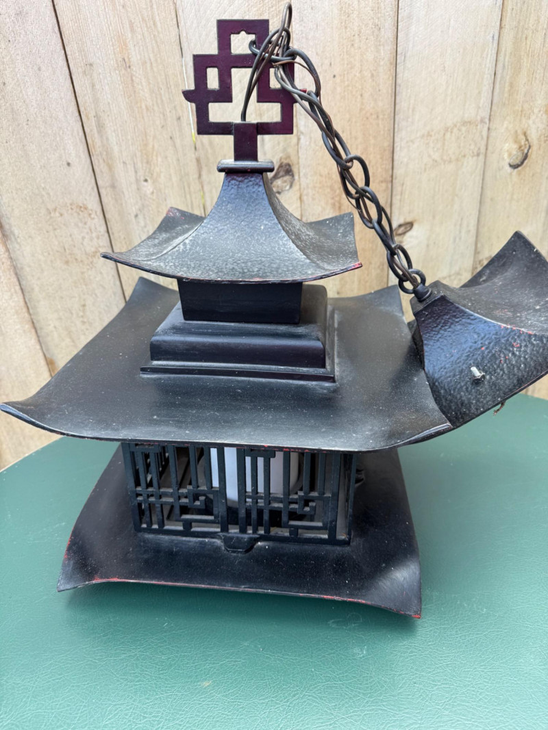1960s Chinese Pagoda Hanging Lantern Chandelier, 18.5″×13″ Est. $800. This 1960s Chinoiserie-style pagoda lantern is crafted from black-finished metal with tiered roofs and lattice panels on all sides. It hangs by its original chain and fits a standard socket (wiring not tested). The finish shows light surface wear and minor paint loss consistent with age.