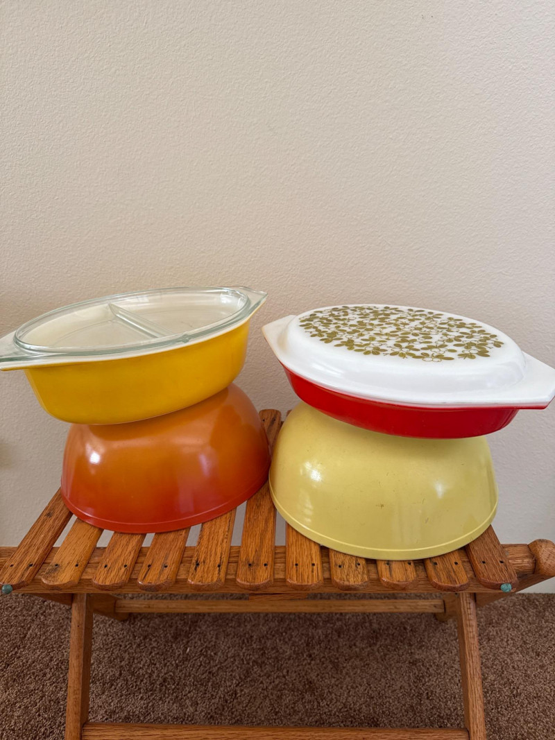 Vintage 1960’s PYREX Verde Divided Casserole, Pyrex FlameGlo, & More This lot includes a collection of vintage Pyrex kitchenware from the 1960s. It features a Pyrex Verde divided casserole dish with its lid, an orange Pyrex Flameglo bowl, a yellow mixing bowl, and another yellow Pyrex dish with a clear lid. These are popular collectible items. Included Pieces: