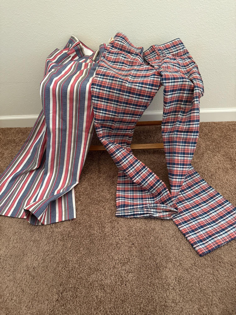 One pair is Sears Toughskins in a red-white-blue plaid (size 30×31), and the other is Koratron striped pants in red, white, and blue (approximate length 30″, fits like a modern size 2). Both pairs have a straight-leg cut and are made from durable polyester-cotton blends.