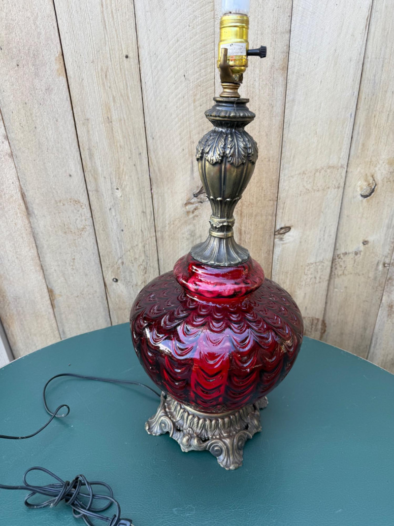 Vintage Hollywood Regency Style Ruby Red Swirl Glass Table Lamp 21" This is a vintage table lamp in the Hollywood Regency style, featuring a rich ruby red glass body with a distinctive raised swirl pattern throughout. It sits on a sculpted metal base with four feet and has an ornate metal neck and socket assembly.