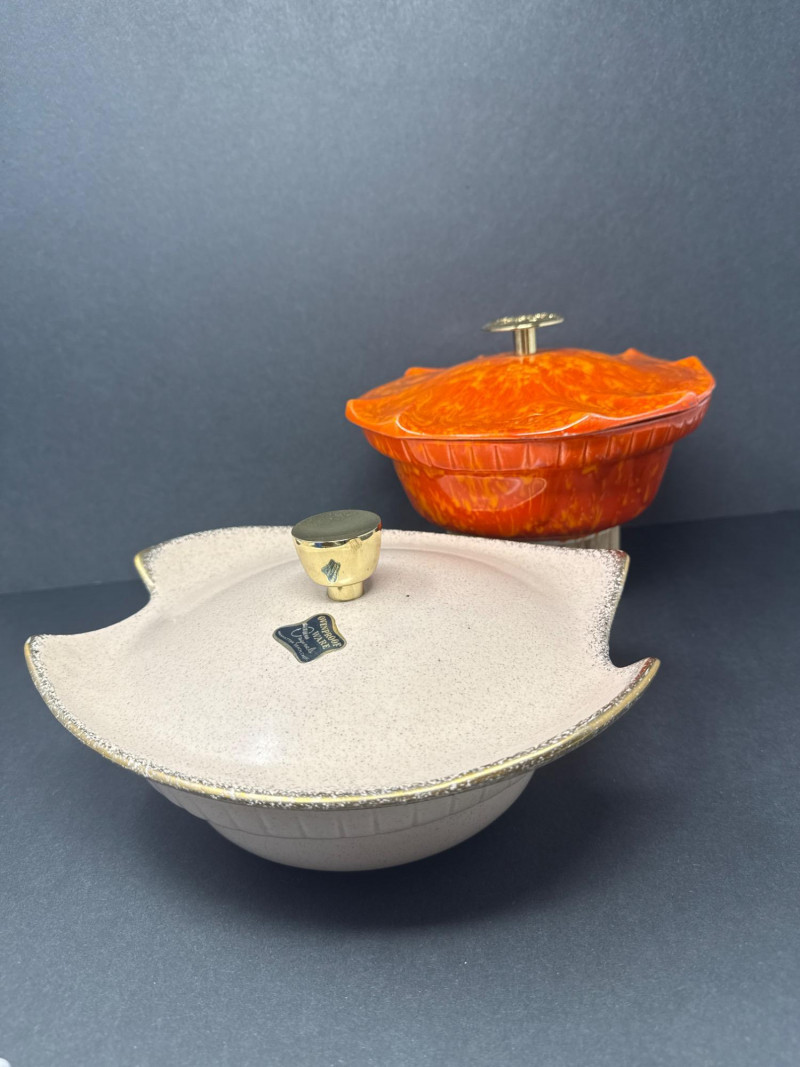 1950s California Pottery Orange Lidded Casserole & MCM Speckled Dish The first is a 1950s California Pottery lidded casserole dish in orange. The second is a Mid-Century Modern (MCM) speckled serving dish, possibly from Quenwood Ware, as suggested by an accompanying tag. Both pieces offer unique textures and colors. The orange casserole dish is suitable for baking and serving, while the speckled dish can be used for appetizers or as a decorative item. They represent different eras of ceramic design.