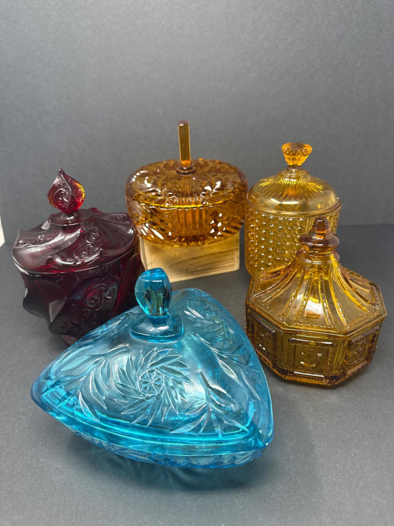 This lot includes five vintage covered glass dishes in assorted colors and molded patterns. The dishes range in height from approximately 2½″ to 7½″ and are ideal for display or holding small items. Assorted Colors & Patterns: One ruby-red dish (floral motif), one light-topaz dish (hobnail pattern), one amber-topaz dish (starburst and spiral design), one bright blue triangular dish (starburst and leaf pattern), and one deep amber octagonal dish (panelled floral/animal scenes). Size Range: Tallest dish measures 7½″ H; shortest is 2½″ H × 5½″ W. Widths generally range from 5″ to 6″. Covered Style: Each dish has a matching lid with a decorative glass finial. Condition: All dishes show light surface wear consistent with age. One amber-topaz dish has a small hairline crack at its base (pictured). No other chips or cracks noted. Sold As-Is: Ideal for collectors or decorative use.