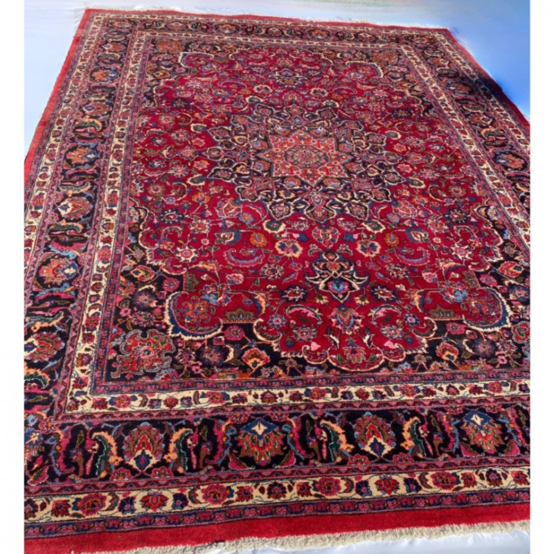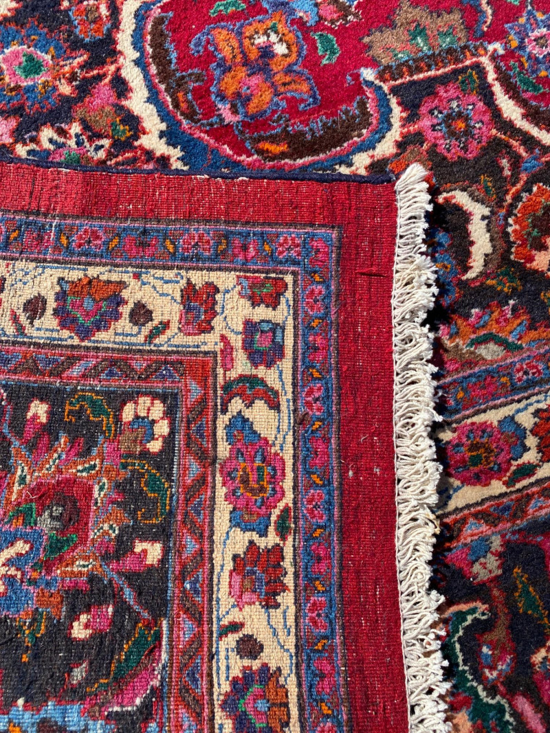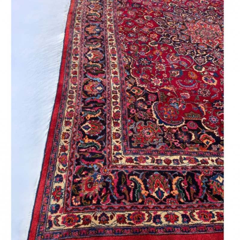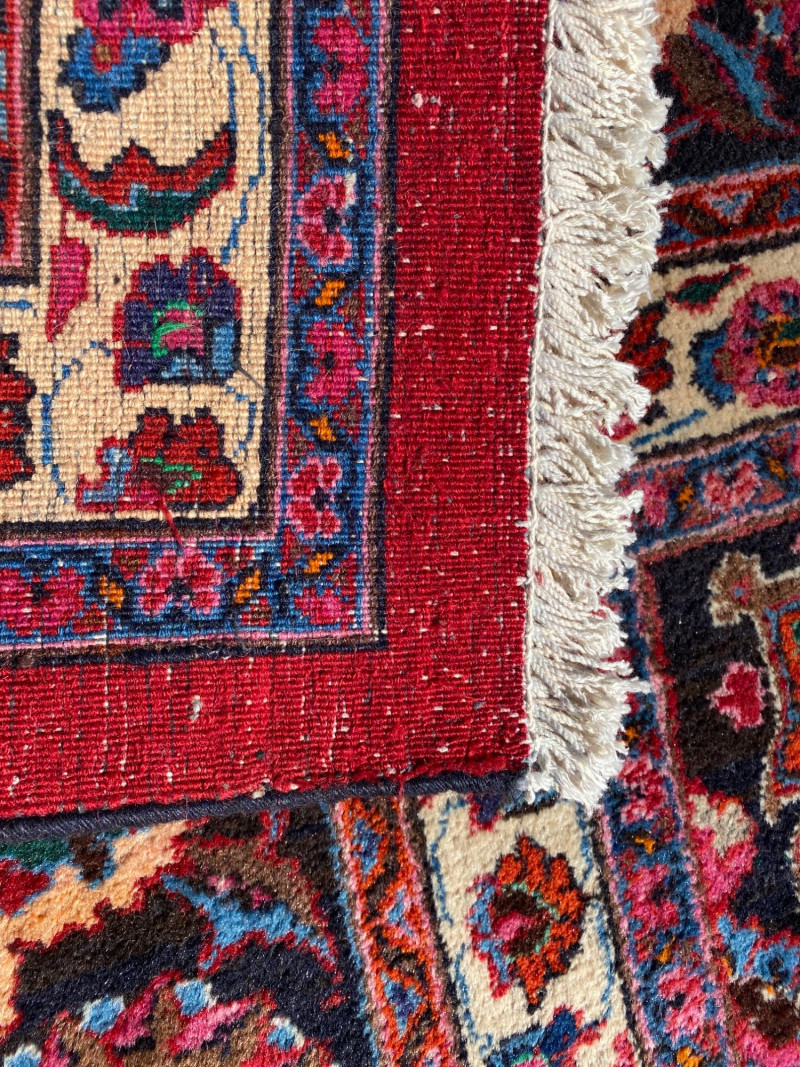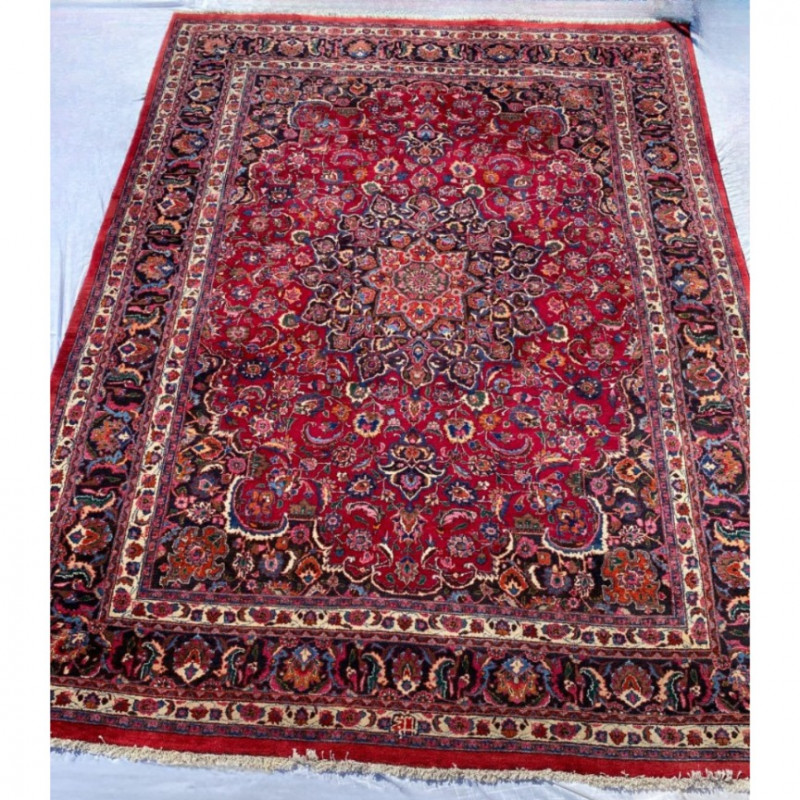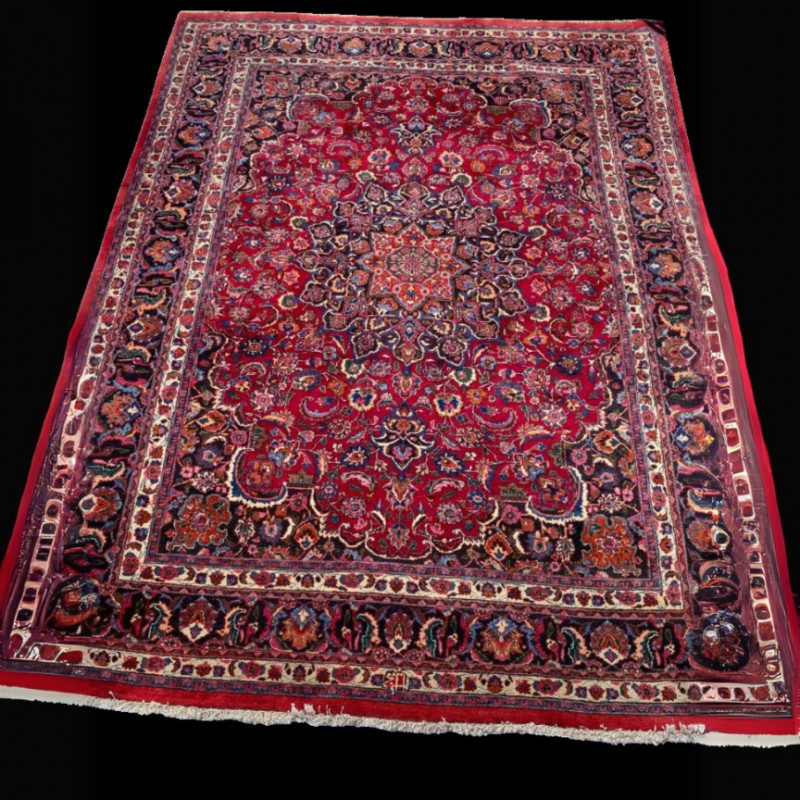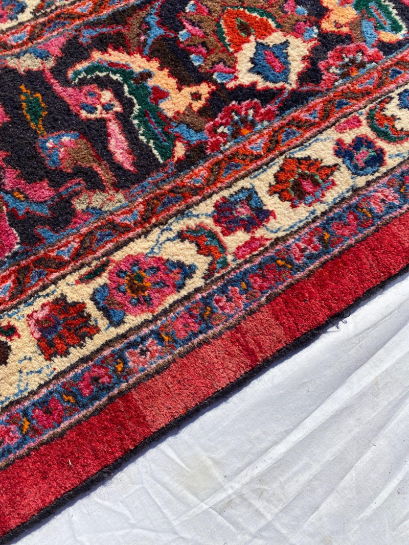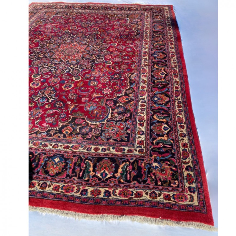 This handcrafted Persian rug showcases the artistry of hand-knotting, with a dense wool pile that offers both durability and warmth. The intricate design features traditional floral and geometric motifs, rendered in a rich palette of deep reds, blues, and ivory. Likely originating from a renowned weaving region such as Tabriz or Kashan, the rug reflects a high level of craftsmanship and cultural heritage. Ideal for collectors or those seeking a statement piece with timeless elegance. Material: Wool pile, hand-knotted foundation Origin: Presumed Persian (Iranian) Design: Traditional floral and geometric motifs Use: Suitable for display or functional use in living spaces