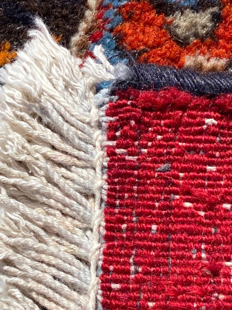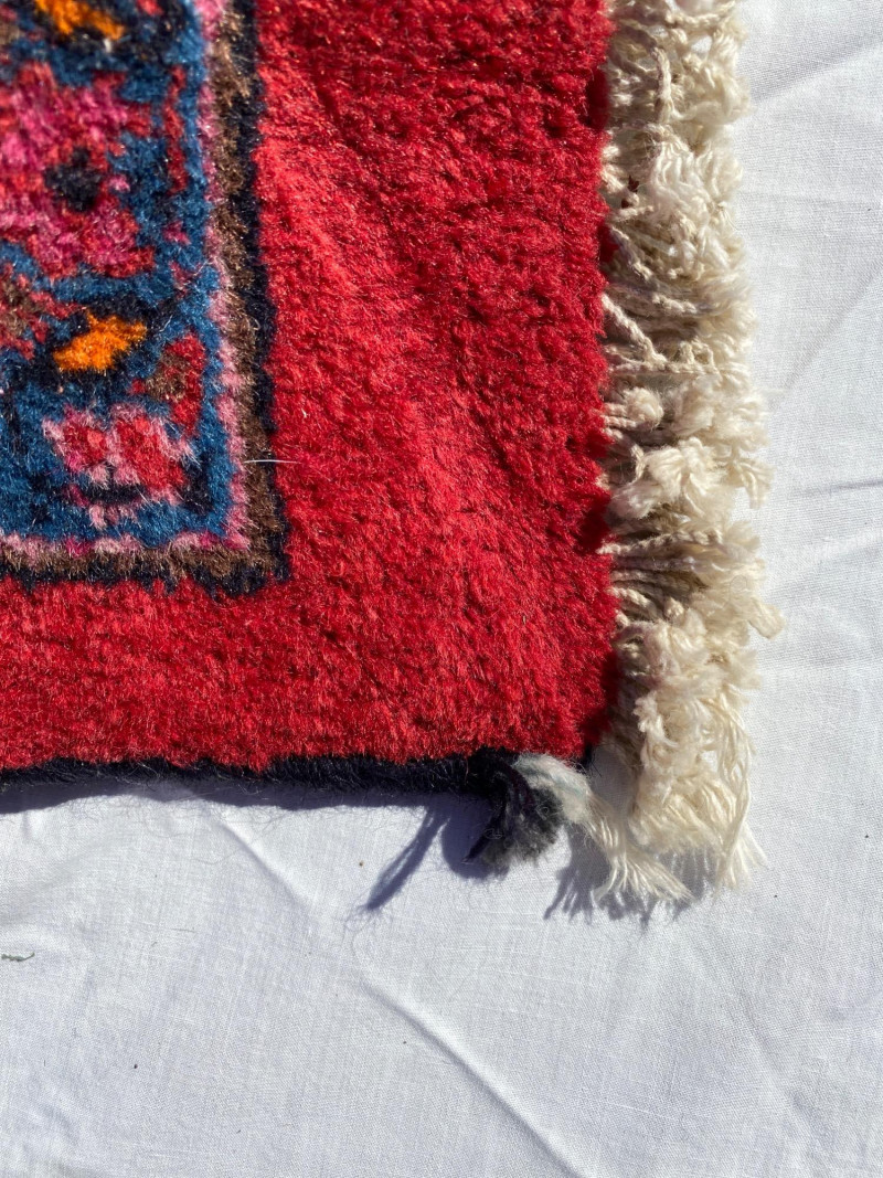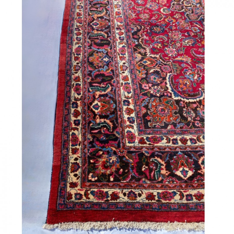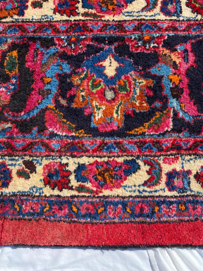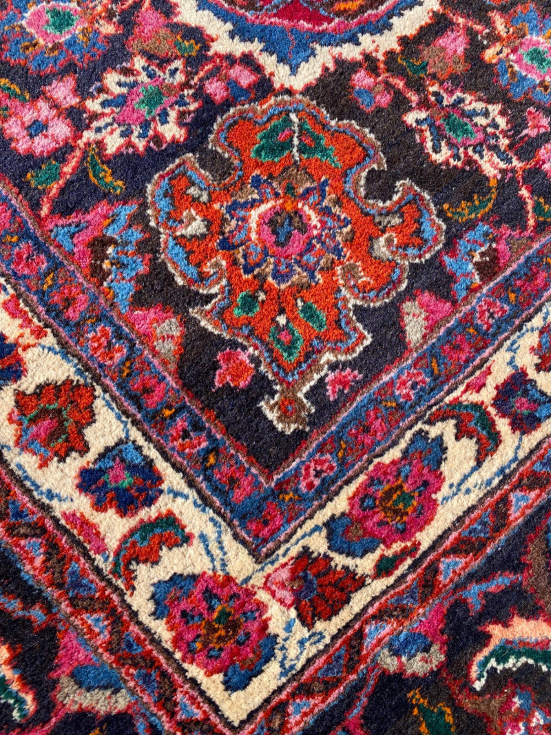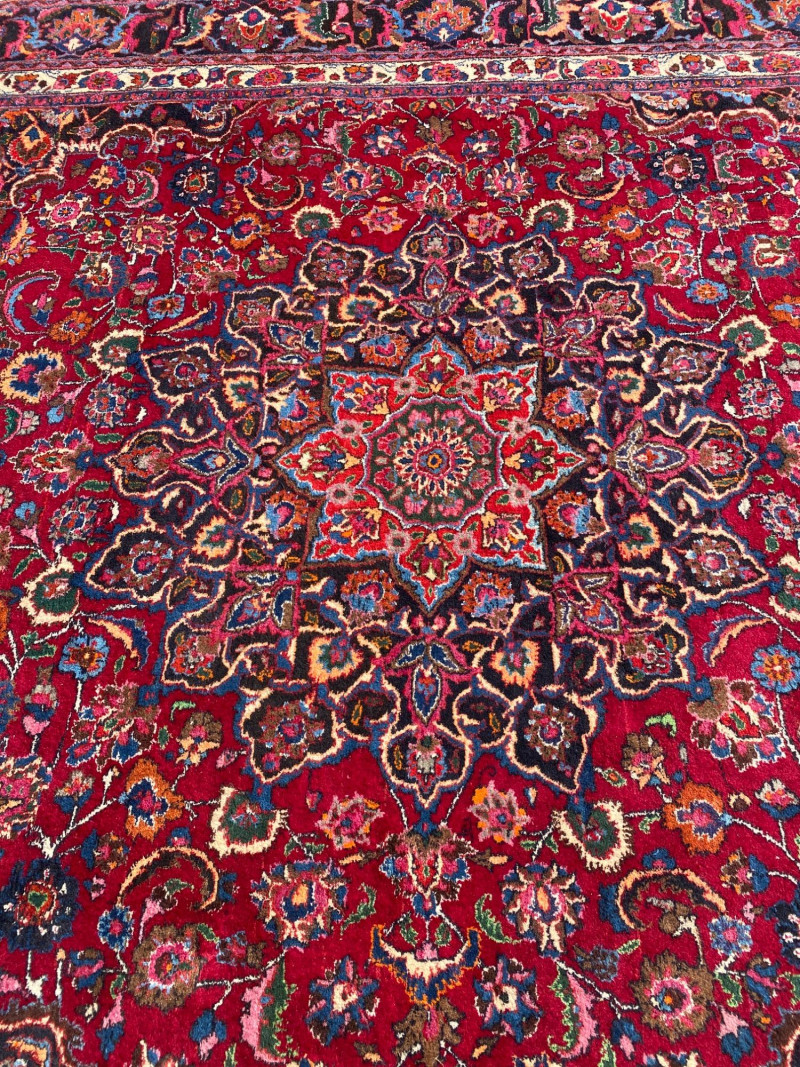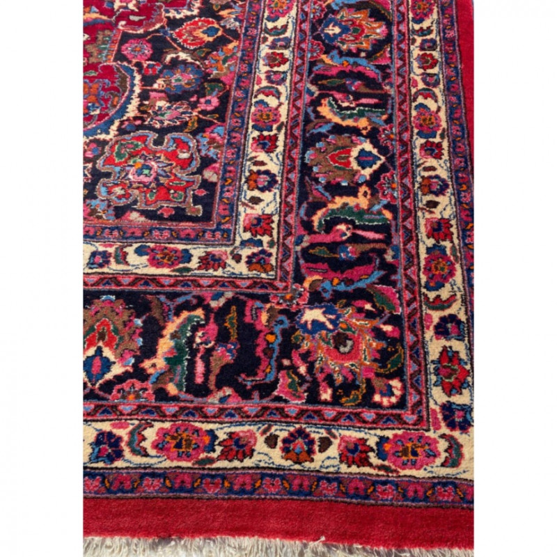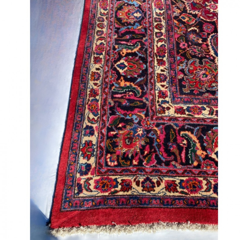 This handcrafted Persian rug showcases the artistry of hand-knotting, with a dense wool pile that offers both durability and warmth. The intricate design features traditional floral and geometric motifs, rendered in a rich palette of deep reds, blues, and ivory. Likely originating from a renowned weaving region such as Tabriz or Kashan, the rug reflects a high level of craftsmanship and cultural heritage. Ideal for collectors or those seeking a statement piece with timeless elegance. Material: Wool pile, hand-knotted foundation Origin: Presumed Persian (Iranian) Design: Traditional floral and geometric motifs Use: Suitable for display or functional use in living spaces