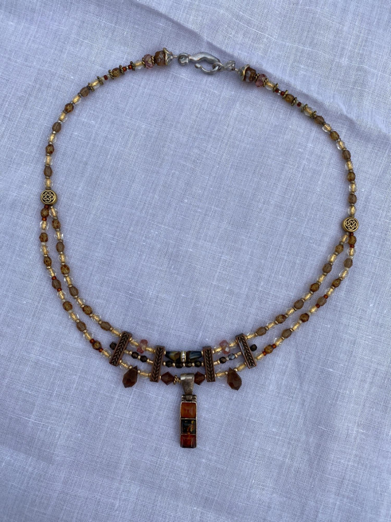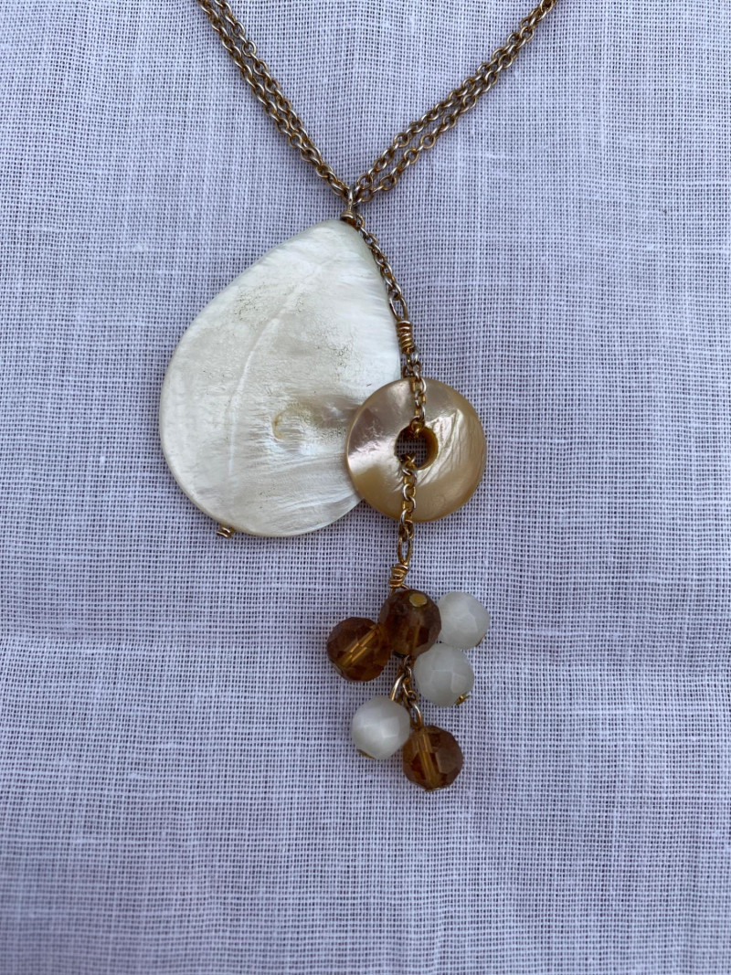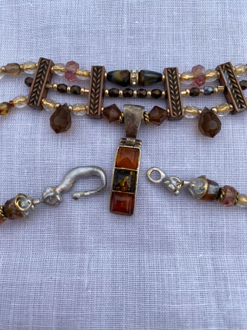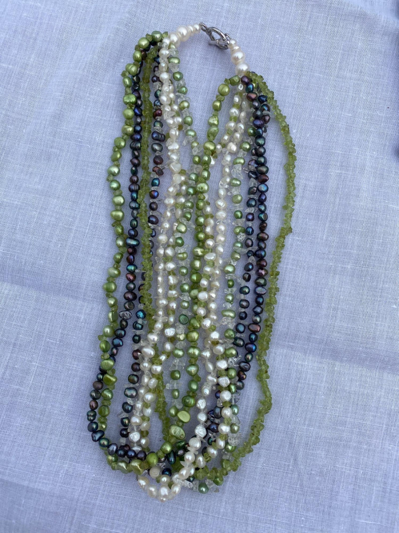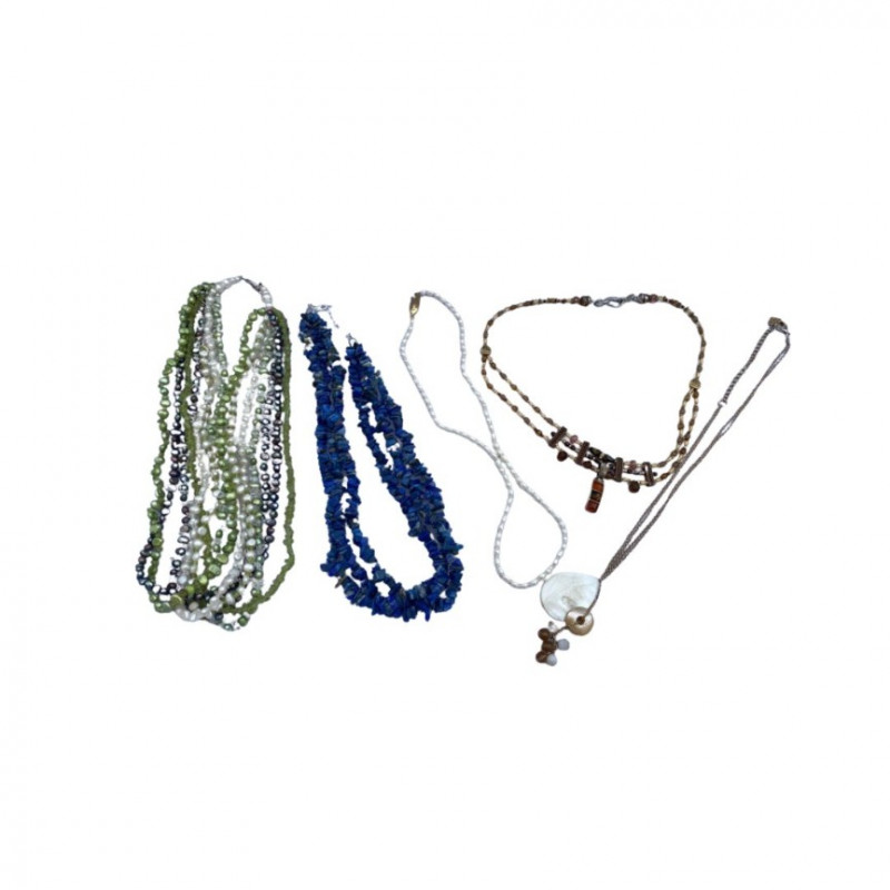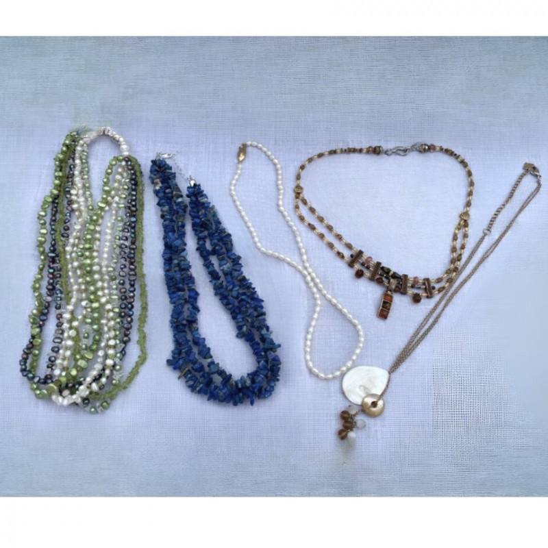 This curated clique of semi-precious drama queens includes pearls, peridot, lapis, amber, and mother of pearl—each handcrafted, each convinced it’s the favorite. Sterling silver clasps, artisan flair, and enough sparkle to start a turf war in your jewelry box. Pearls & Peridot Necklace – Full length: 19½" Lapis Lazuli Necklace – Sterling silver clasp, full length: 18½" Rice Pearls Necklace – Clasp marked “silver,” total length: 19" Crystal & Amber Pendant Necklace – Amber set in sterling, total length: 17" Mother of Pearl Necklace by Cookie Lee – Total length: 18" Each piece showcases unique materials and artisan craftsmanship, offering a blend of elegance and natural beauty. Ideal for collectors or everyday wear.