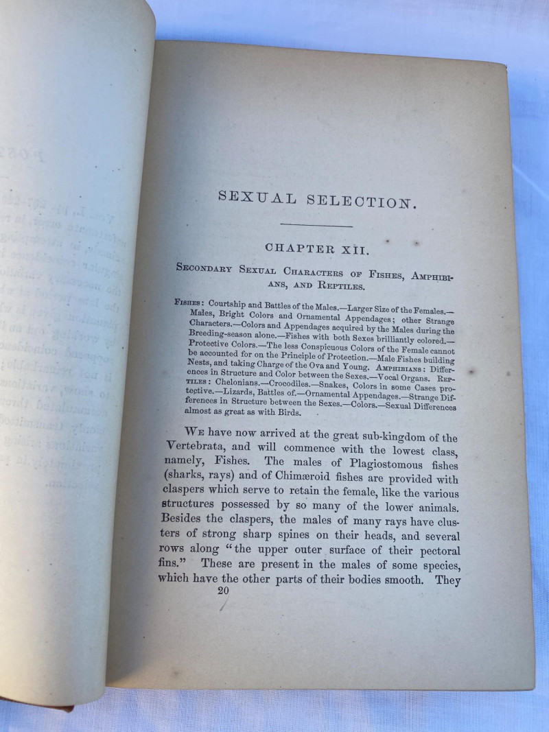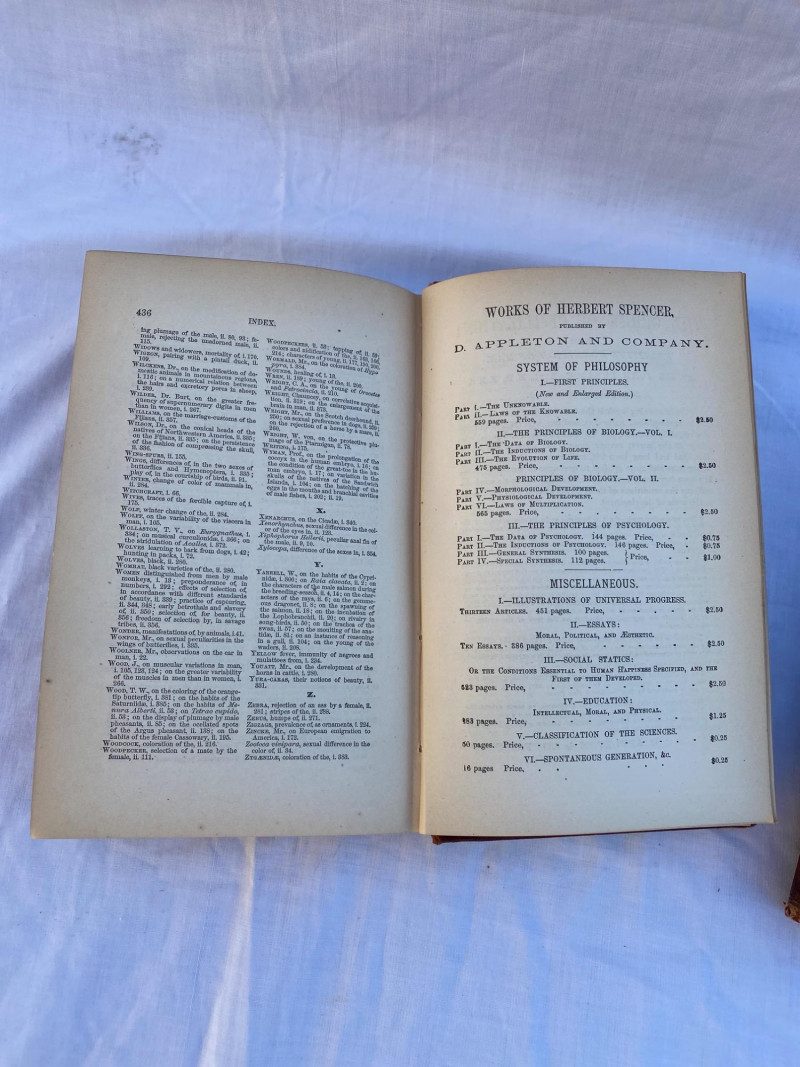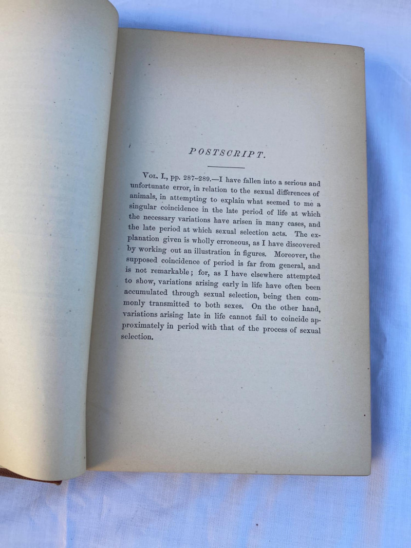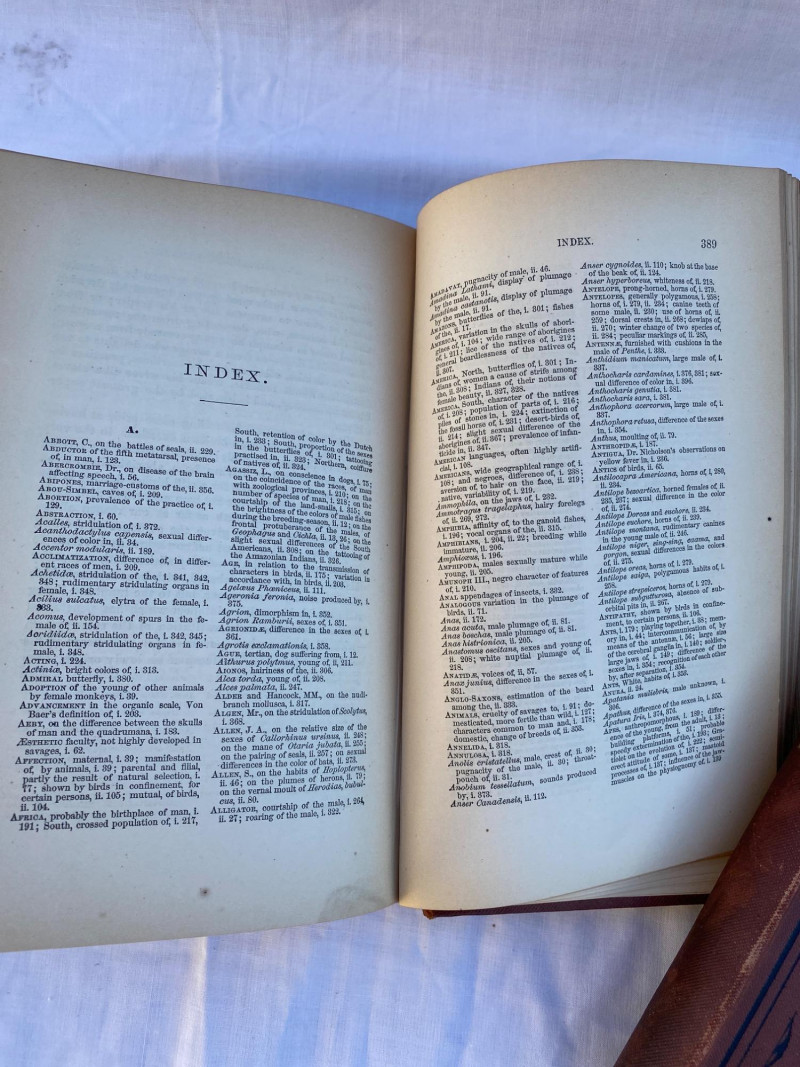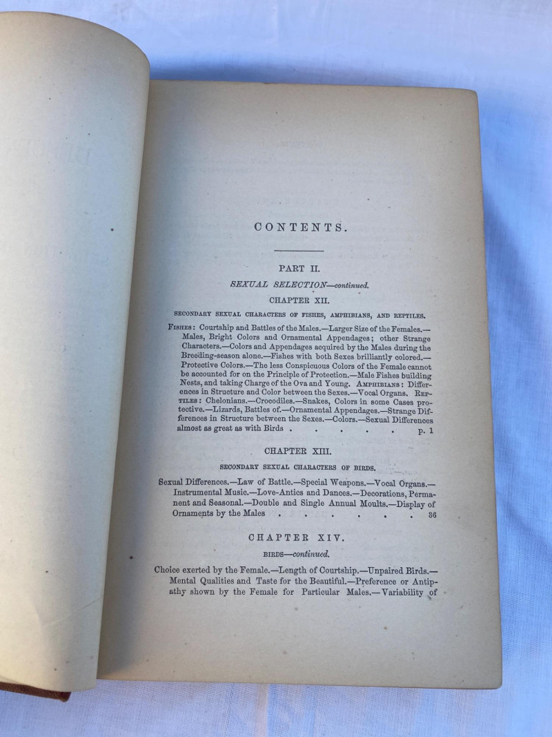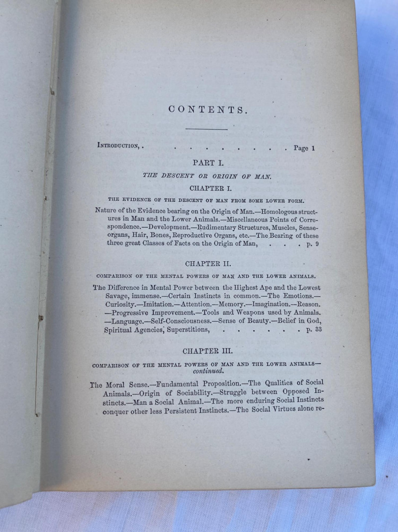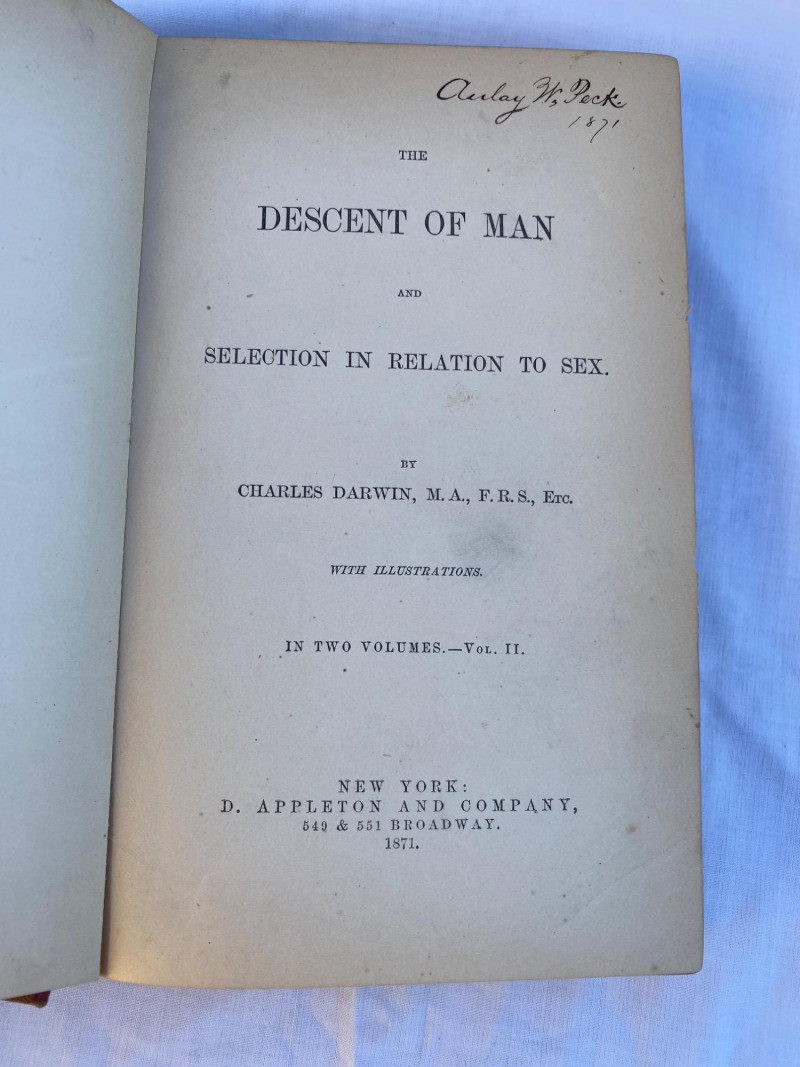 First American edition of The Descent of Man by Charles Darwin, presented in two volumes. Volume Two includes an index and six pages of advertisements for other contemporary publications. A foundational work in evolutionary theory, this edition offers historical and scientific significance for collectors and scholars alike.