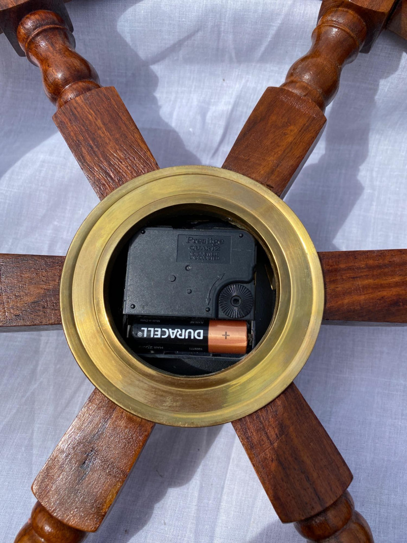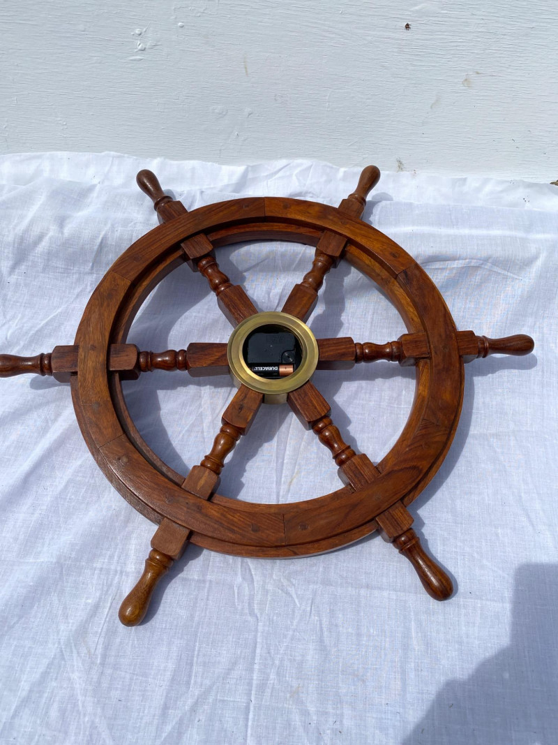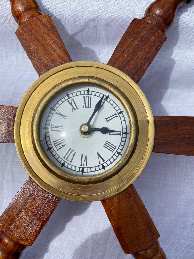 Lot # 13 - Vintage Wooden Ship’s Wheel Clock – 25" Handle Span, Working Condition