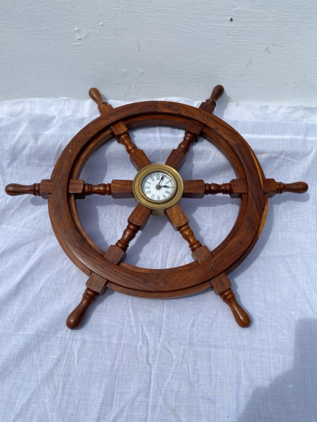 Nautical-style wooden ship’s wheel clock with a working timepiece at its center. The wheel itself measures 17½" in diameter, with a full span of 25" from handle to handle. A classic maritime accent, perfect for themed décor or collectors of nautical memorabilia. Diameter: 17½" Handle Span: 25" Condition: Clock is working Style: Nautical / Maritime Material: Wood