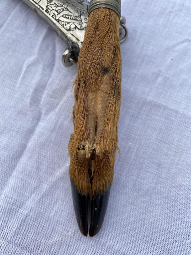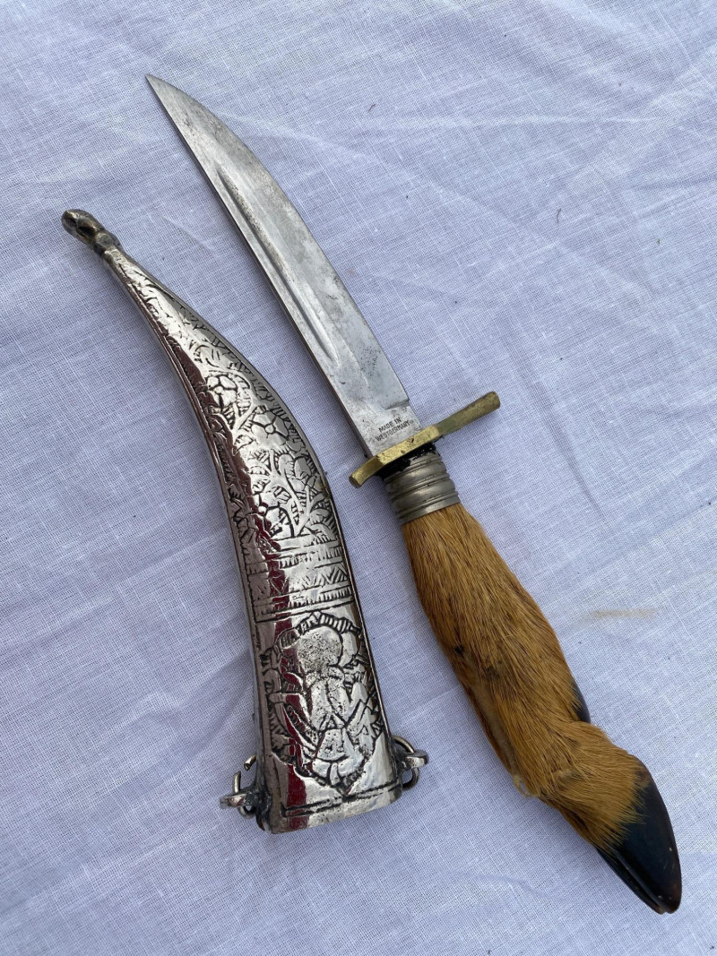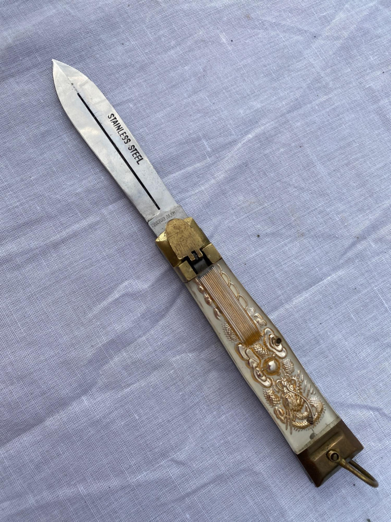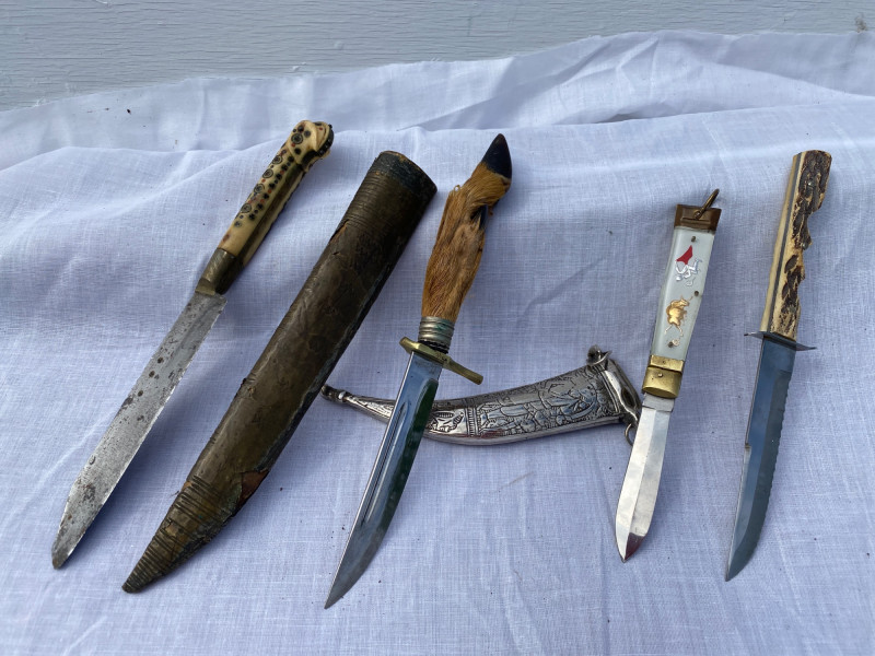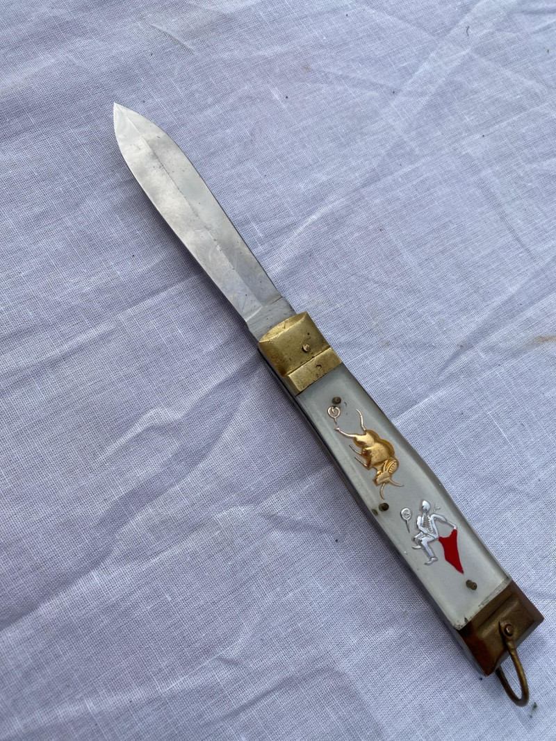 A striking set of four exotic knives featuring unique designs and varied blade lengths. One knife showcases a bullfighter motif and does not close; the others range in blade length from 3" to 5½". These pieces are ideal for display, conversation, or collectors of unusual blades and global styles. Quantity: 4 knives Blade Lengths: 3" to 5½" Notable Detail: Bullfighter knife is fixed (does not close) Style: Decorative / Exotic / Collectible