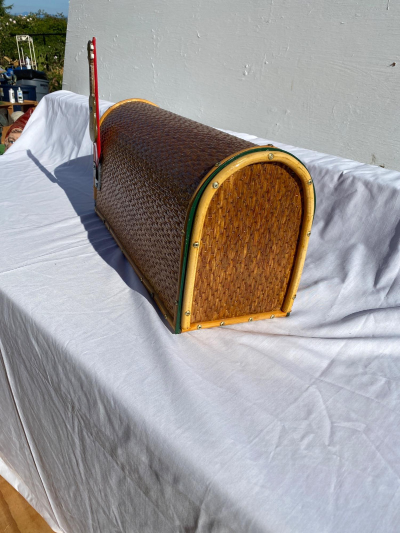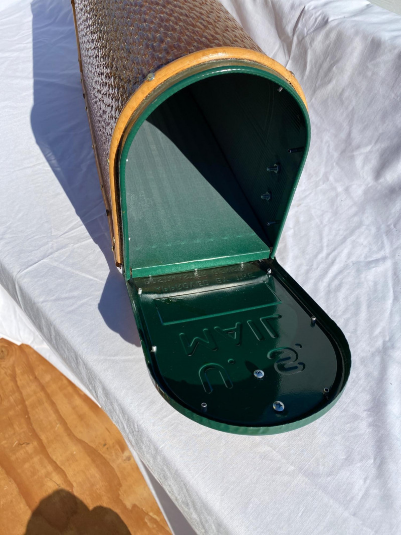A one-of-a-kind decorated mailbox signed by the artist. Folk art flair meets functional charm—perfect for porch display or conversation. This regulation mailbox can be used outside or as a creative file holder.
