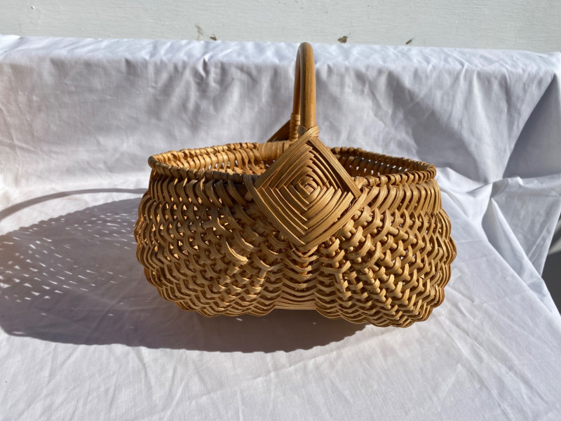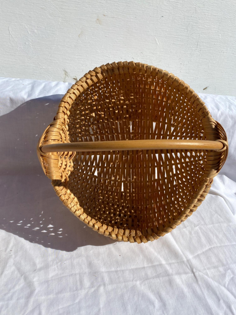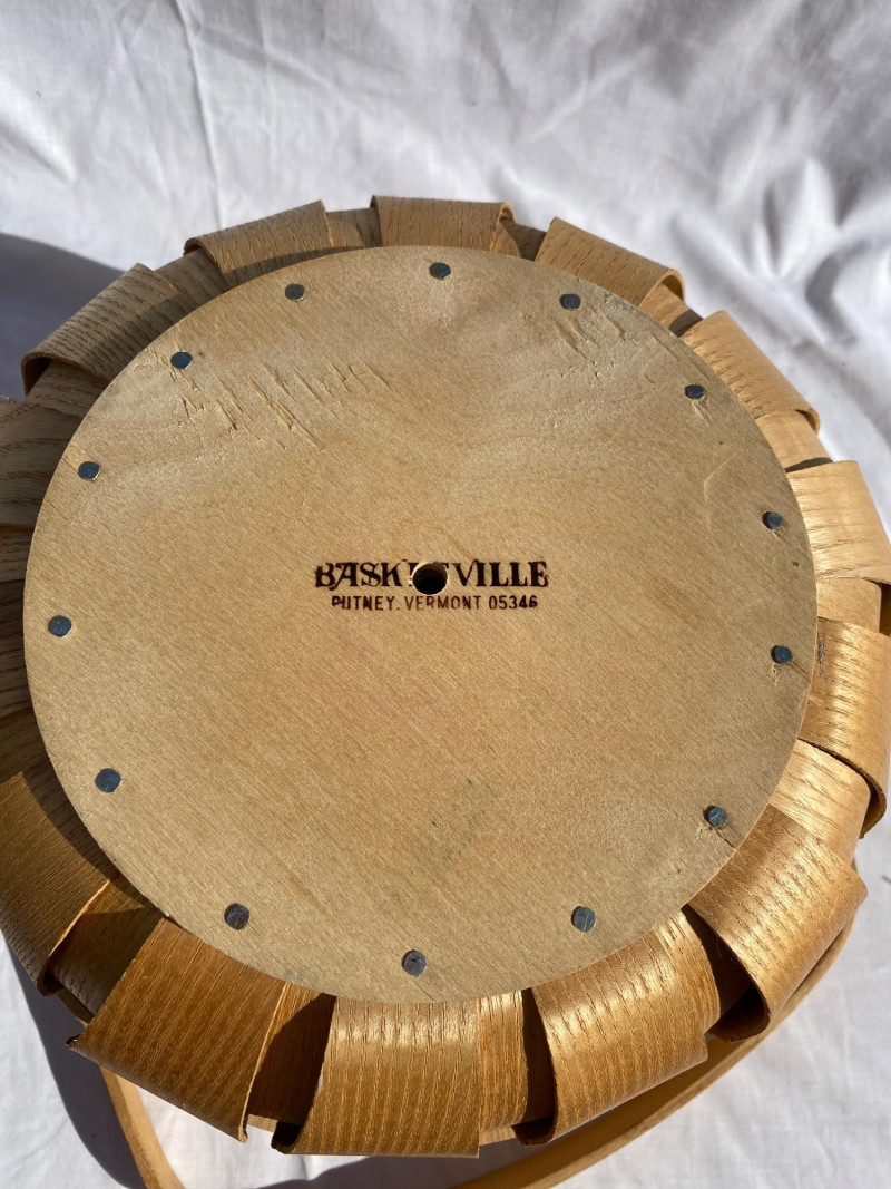 Classic butt basket with signature, paired with a Basketville piece. A celebration of traditional basketry and American craftsmanship. This dynamic duo includes a signed classic butt basket (yes, that’s the real name) and a Basketville piece that’s basically the Martha Stewart of woven storage. Together, they’re a celebration of curves, craftsmanship, and the kind of rustic charm that makes you want to store apples, yarn, or unsolicited advice.