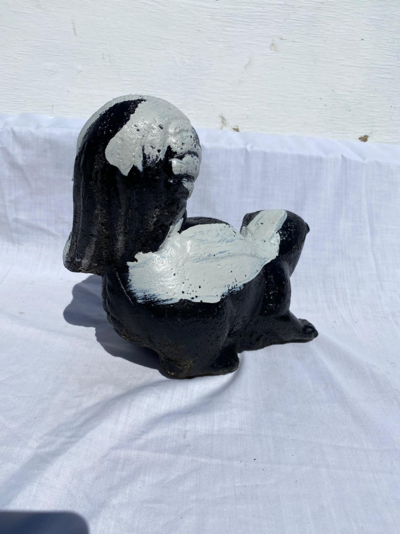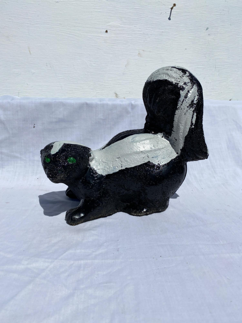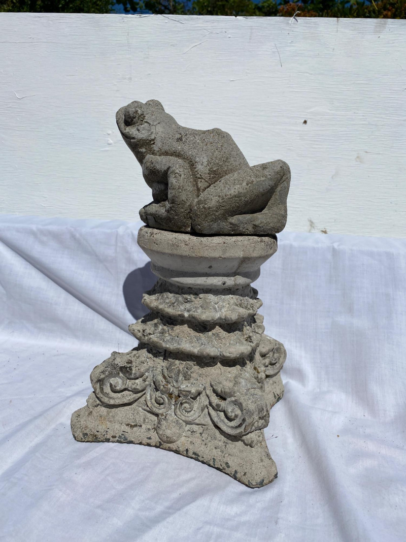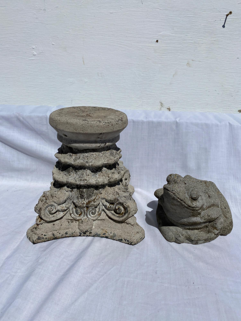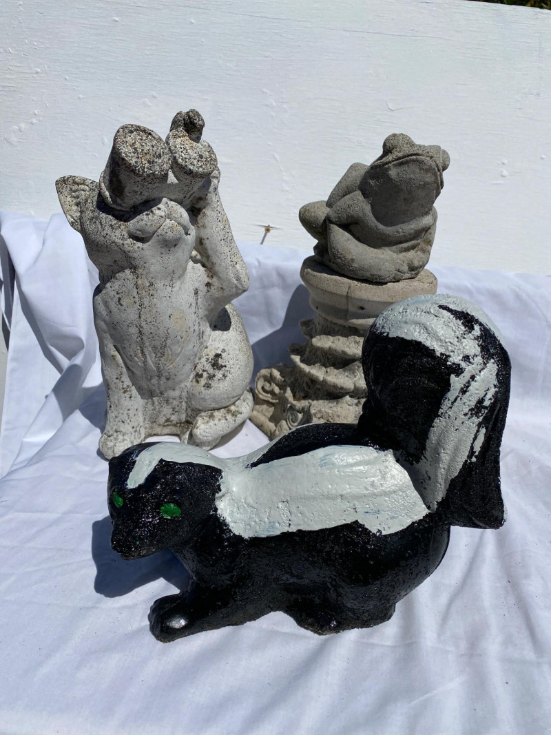 Lot # 28 - Three Cement Critters & Pedestal – Skunk, Frog & Cat Garden Set