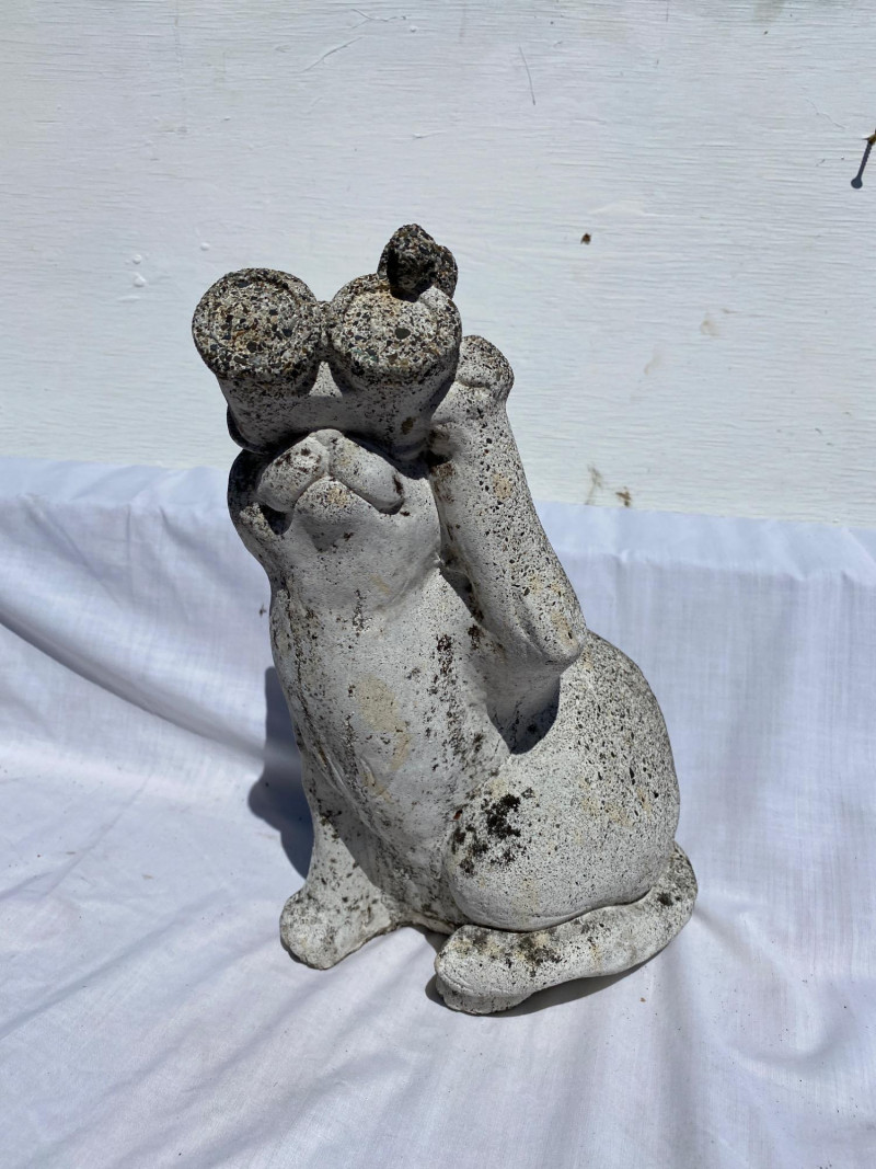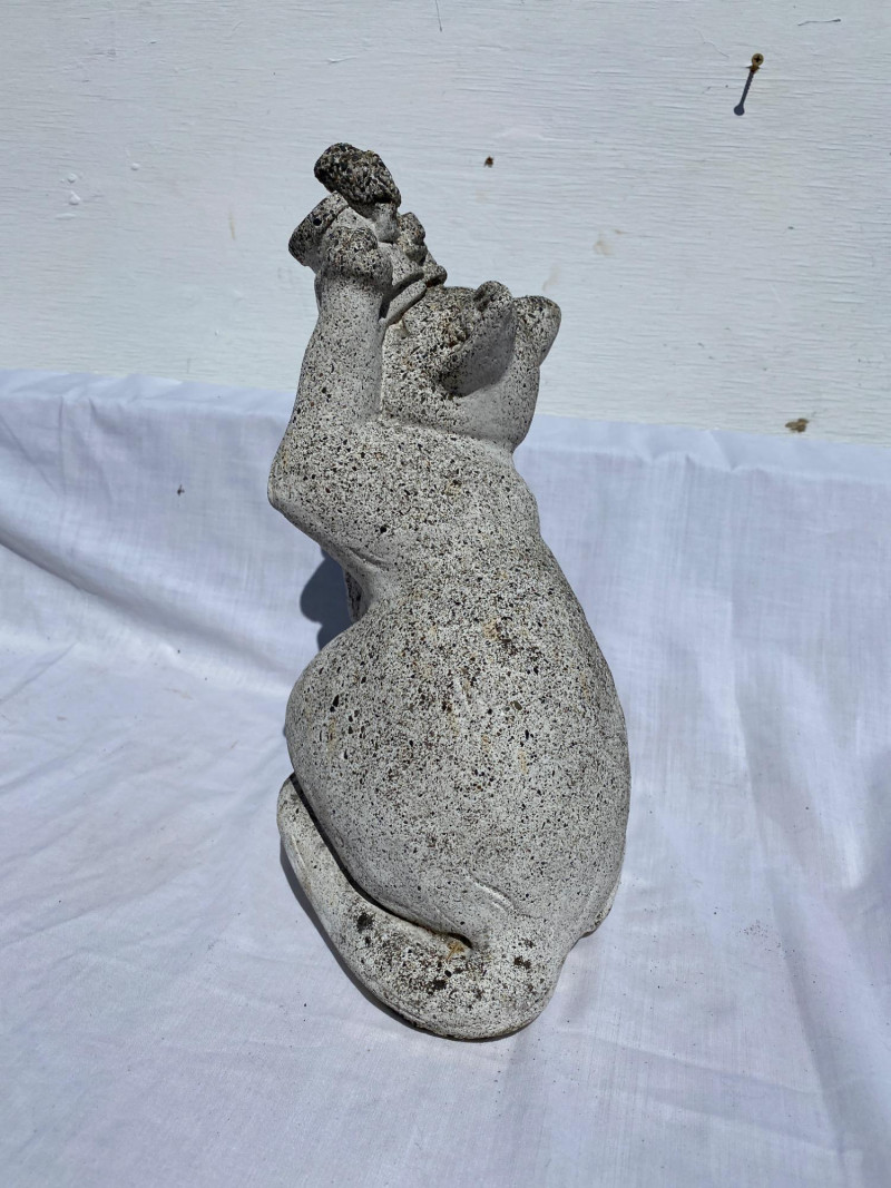 A playful trio of cement garden creatures—skunk (10"), frog (7"), and bird-watching cat (13")—paired with a sturdy pedestal (8" tall). Each piece features weathered texture and outdoor durability. A charming set for garden display.