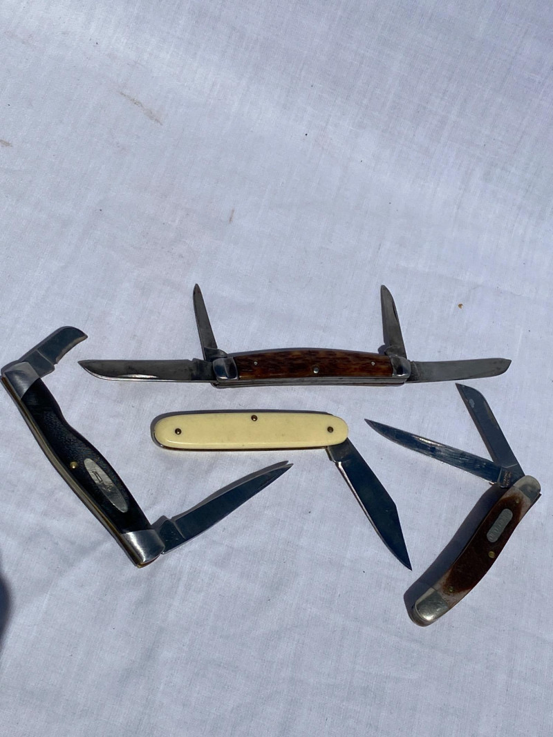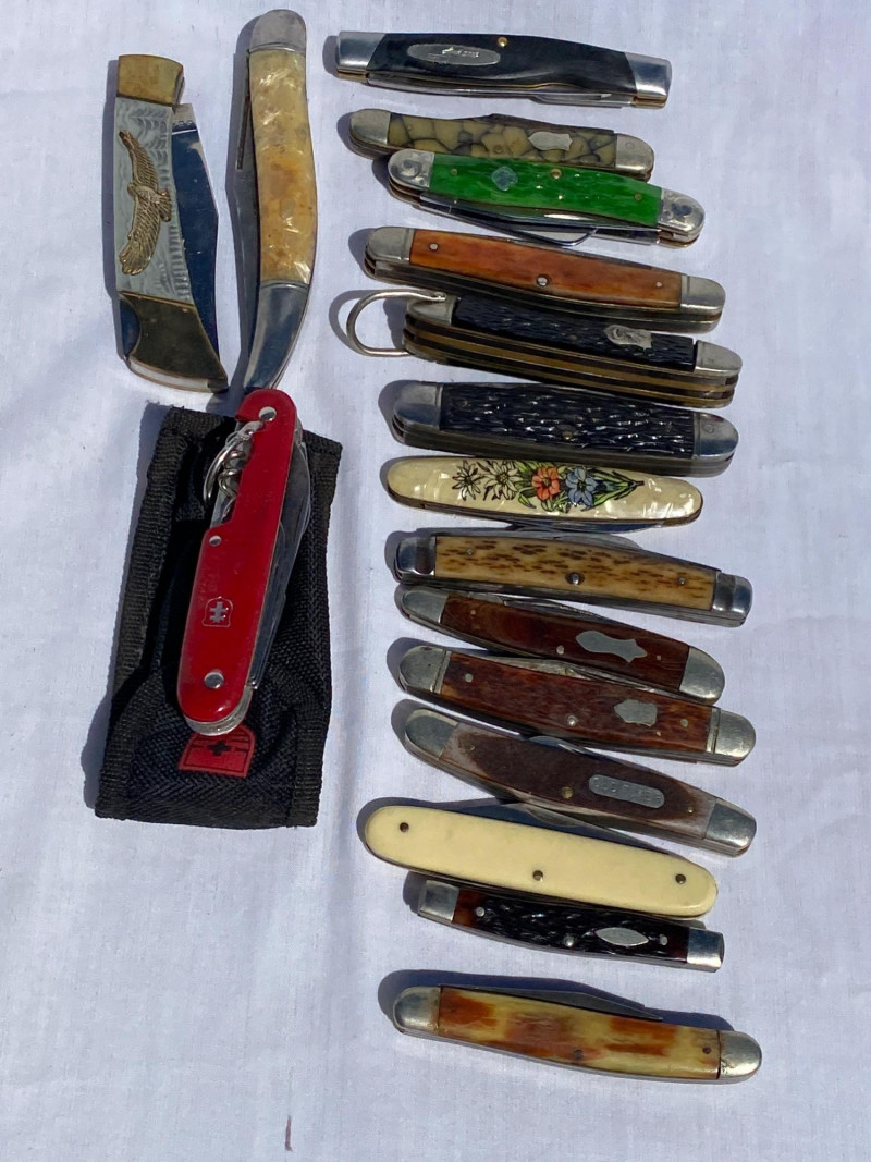 A diverse collection of 17 pocket knives, both marked and unmarked. Includes a Case knife and other varied styles - Weatern, Hammer, Kutmaster, Buck, Boker, Schrade, Colonial and Camillus. Great for collectors, restoration, or display.