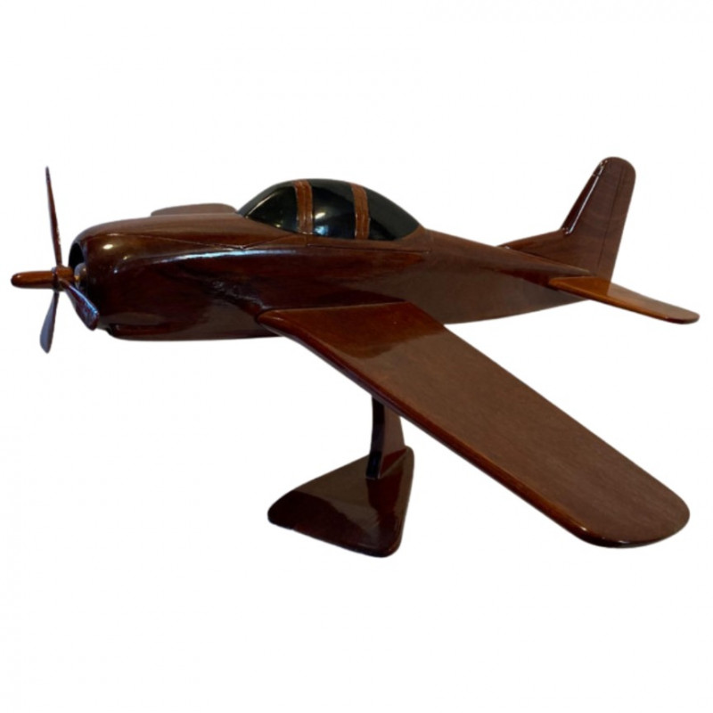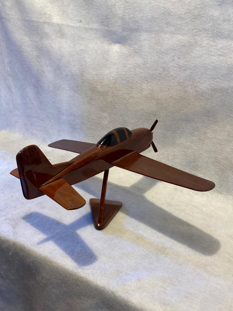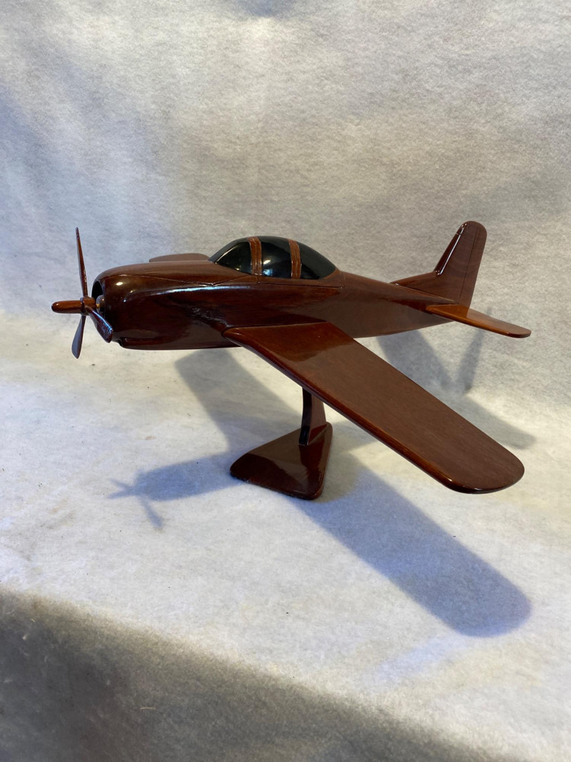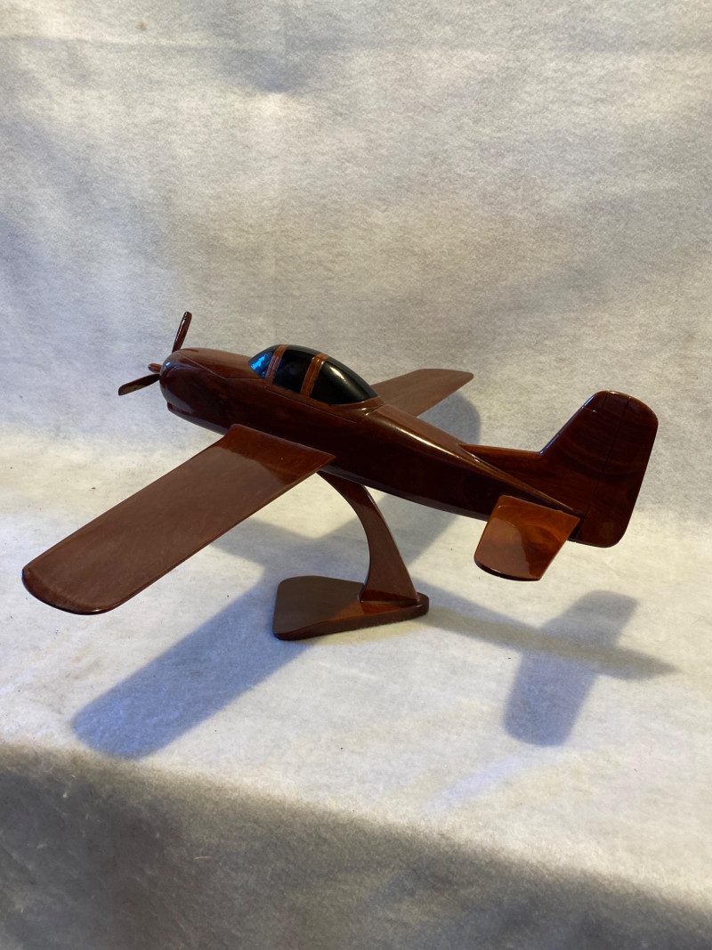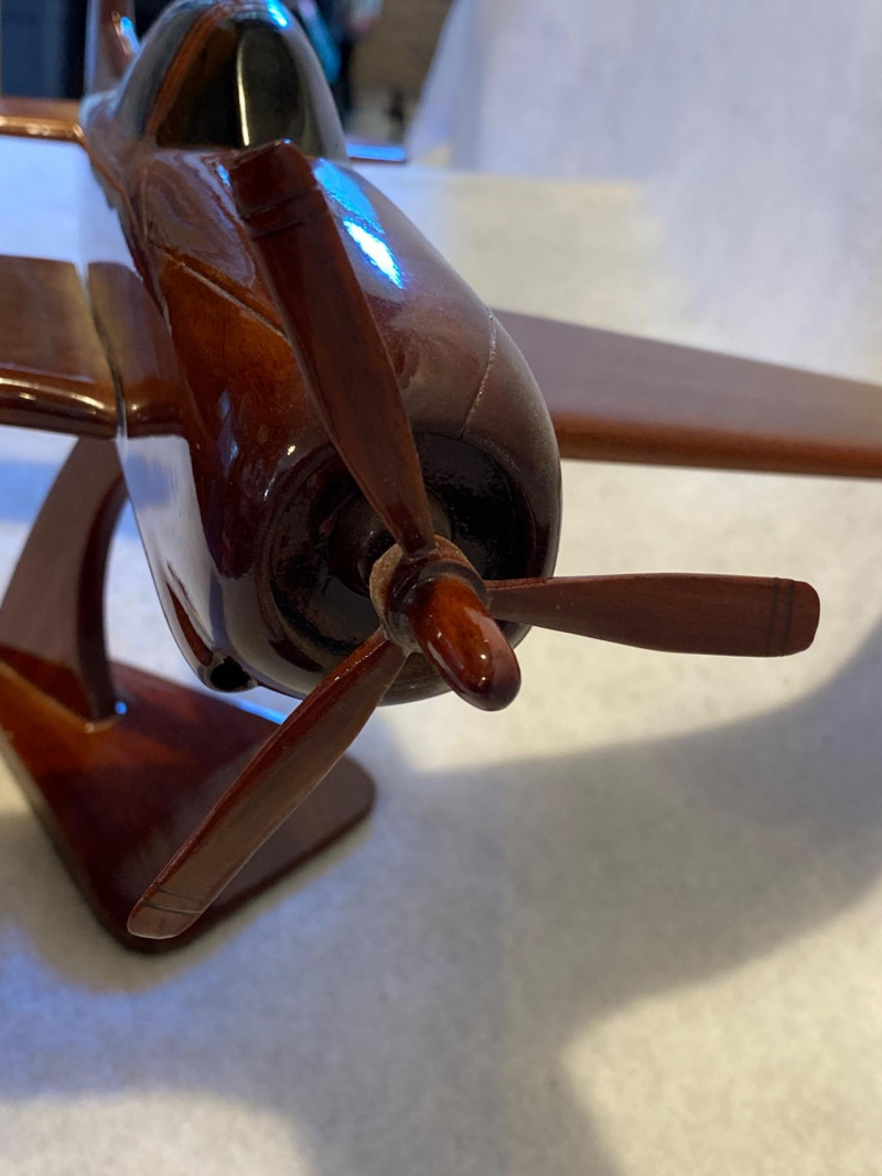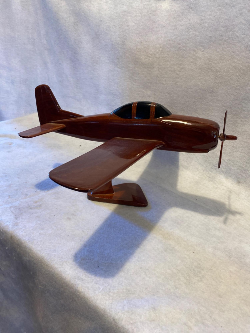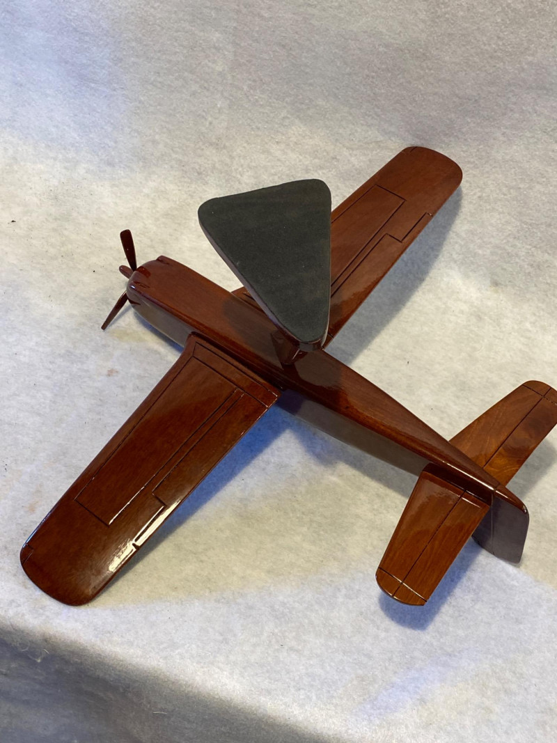 "A Trainer with Swagger" Superbly Crafted…beautiful to look at…prop to tail 16 inches and 8 inches tall…wing span 19 inches…made of Mahogany. History of the T-28 Trojan: Back in the 1950s, when aviator sunglasses were practically a personality trait, the North American T-28 Trojan burst onto the scene as the U.S. military’s new go-to trainer plane. Designed to replace the aging T-6 Texan, the Trojan wasn’t just a classroom in the sky—it was a flying muscle car with wings. Built Tough: With a radial engine that roared like a lion and a frame that could take a beating, the T-28 was the kind of plane that made student pilots feel like aces before they even earned their wings. Navy’s Favorite: The Navy loved it so much they kept it around until 1984, using it for everything from basic flight training to carrier landing practice (yes, it had a tailhook!). Double Duty: Not content with just teaching rookies, the Trojan moonlighted as a counter-insurgency aircraft during the Vietnam War. It carried bombs, rockets, and even napalm—talk about a career pivot. Global Fame: Nearly 2,000 were built, and they flew for over 30 countries. It was the kind of plane that got invited to all the cool hangars. Today, the T-28 lives on as a beloved warbird in airshows, where it still turns heads and rattles eardrums. And this handcrafted mahogany model? It’s like having a piece of aviation swagger parked right on your shelf.