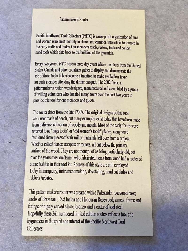 Lot # 50 - Patternmaker’s Router – Pacific Northwest Tool Collectors Gem