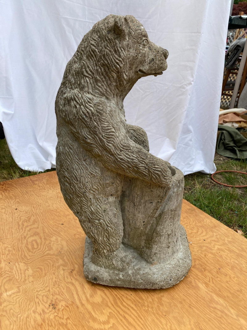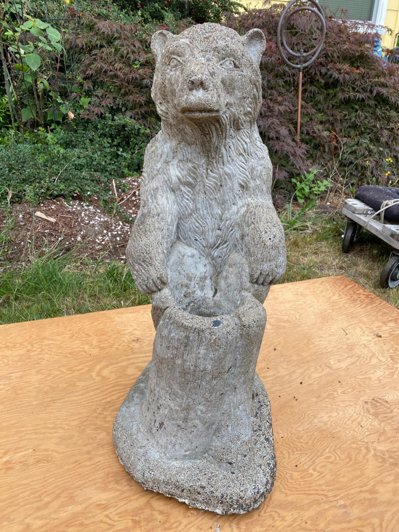“28 inches of concrete charisma—bring a friend and a dolly” This hefty cement bear stands 28" tall and 14" deep at the base, radiating stoic charm and undeniable mass. Whether guarding your garden or anchoring your porch with ursine gravitas, he’s not going anywhere without backup. A beast of burden and beauty—perfect for those who like their décor with weight and whimsy. This bear is 28 inches tall and 14 inches deep at the base…he is a real beast bring a friend to help move him.