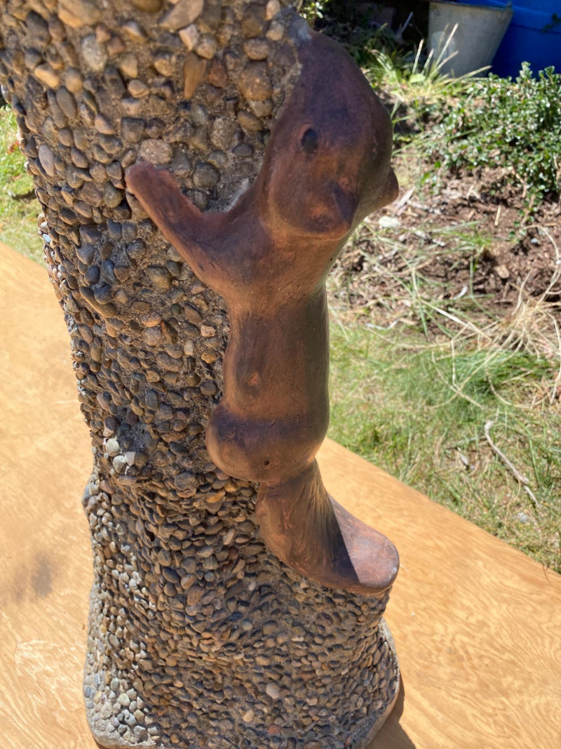 A beautifully crafted exposed aggregate birdbath with a textured finish that blends seamlessly into natural landscapes. Standing 29" tall with a wide 23" diameter bowl, it offers ample space for feathered visitors and visual impact for garden stylists. A charming squirrel motif is subtly sculpted into the pedestal, adding a touch of woodland whimsy to its rugged, refined presence. Ready to anchor your outdoor oasis.