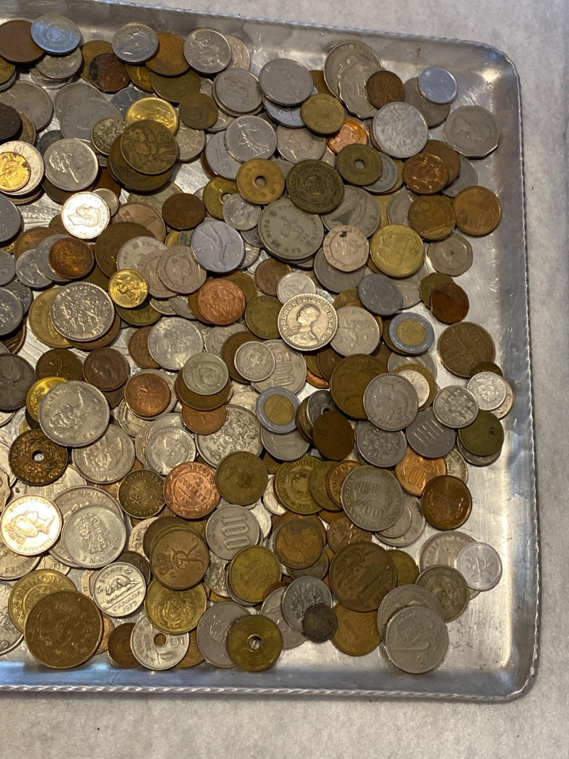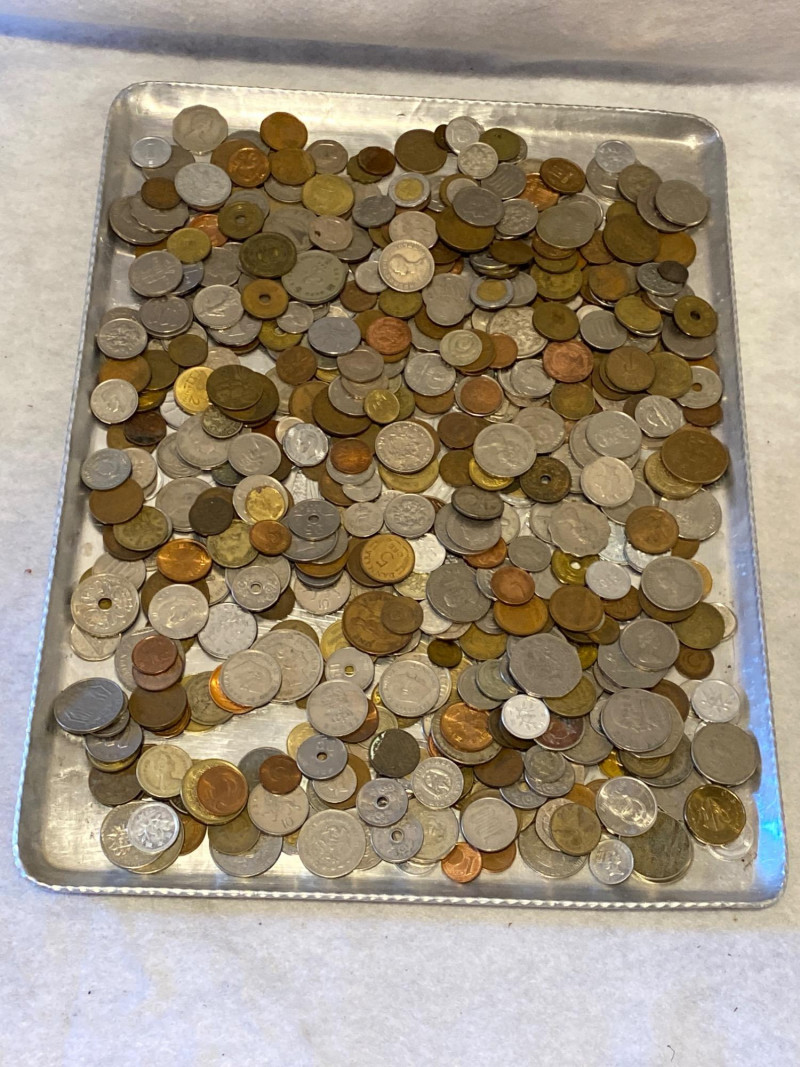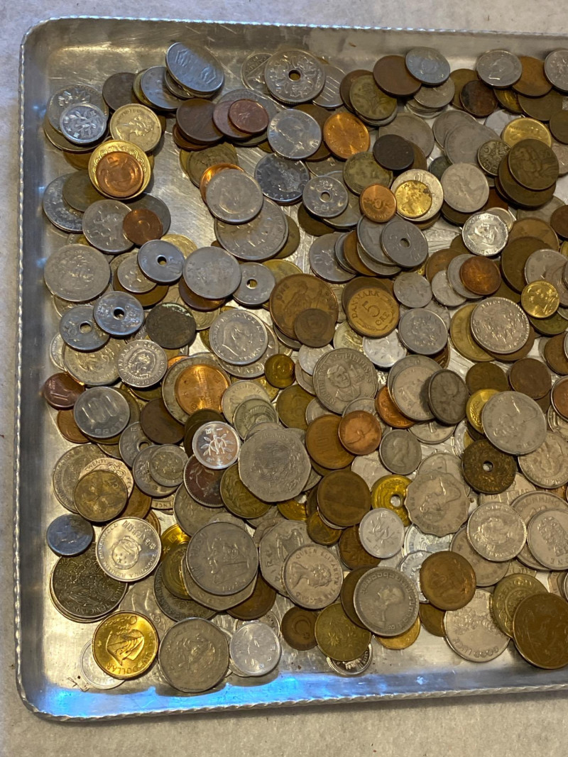 A scattered parliament of pocket change, gathered from decades of travel, trade, and drawer-bottom discoveries. Nestled in a utilitarian aluminum tray—lightweight, dented, and vaguely diplomatic—this collection includes: Coins from multiple countries and eras Varied denominations, metals, and patinas It’s a miniature treasury of global wanderings, perfect for the curious numismatist or the daydreaming diplomat.