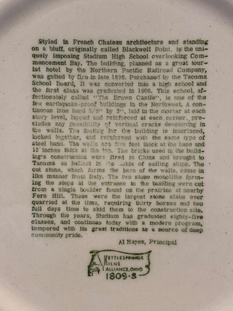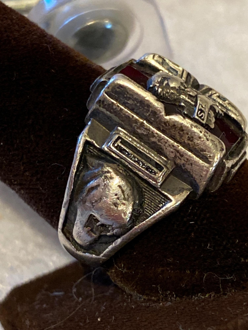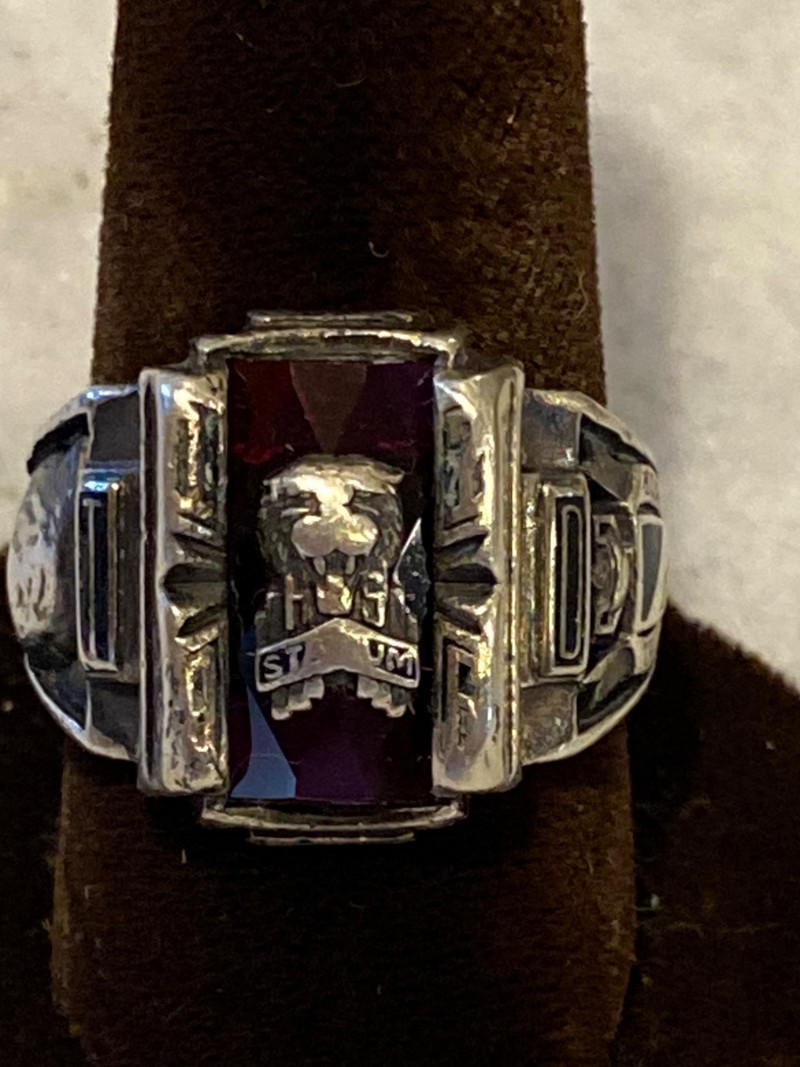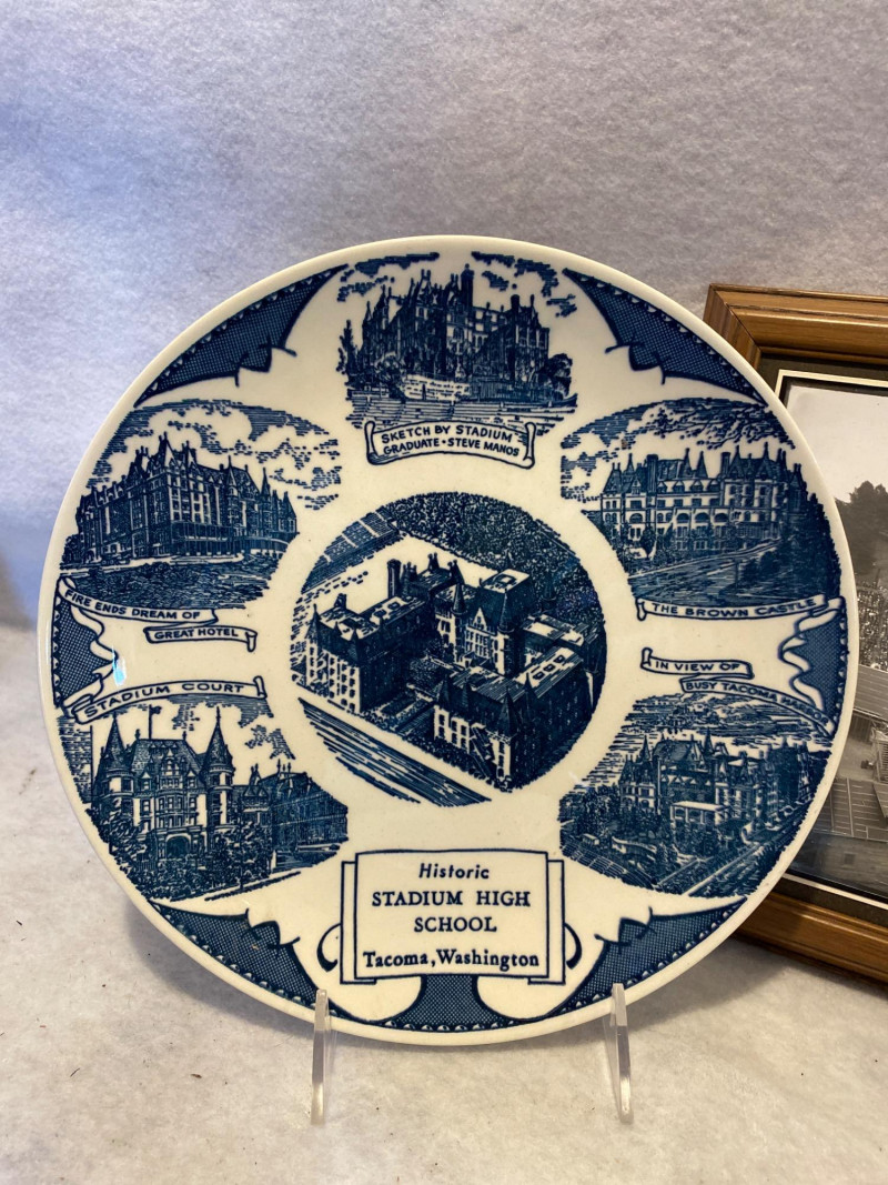 A nostalgic trio of Stadium High School keepsakes. The 1926 sterling silver class ring by Josten features a red glass stone and engraved student name inside. Though slightly bent, it may size to a 9 if reshaped. Accompanying it is a 10″ blue transferware plate Photo depicting a real photo scene—likely a military celebration—framed without glass. A rare glimpse into Tacoma’s scholastic and civic pride.