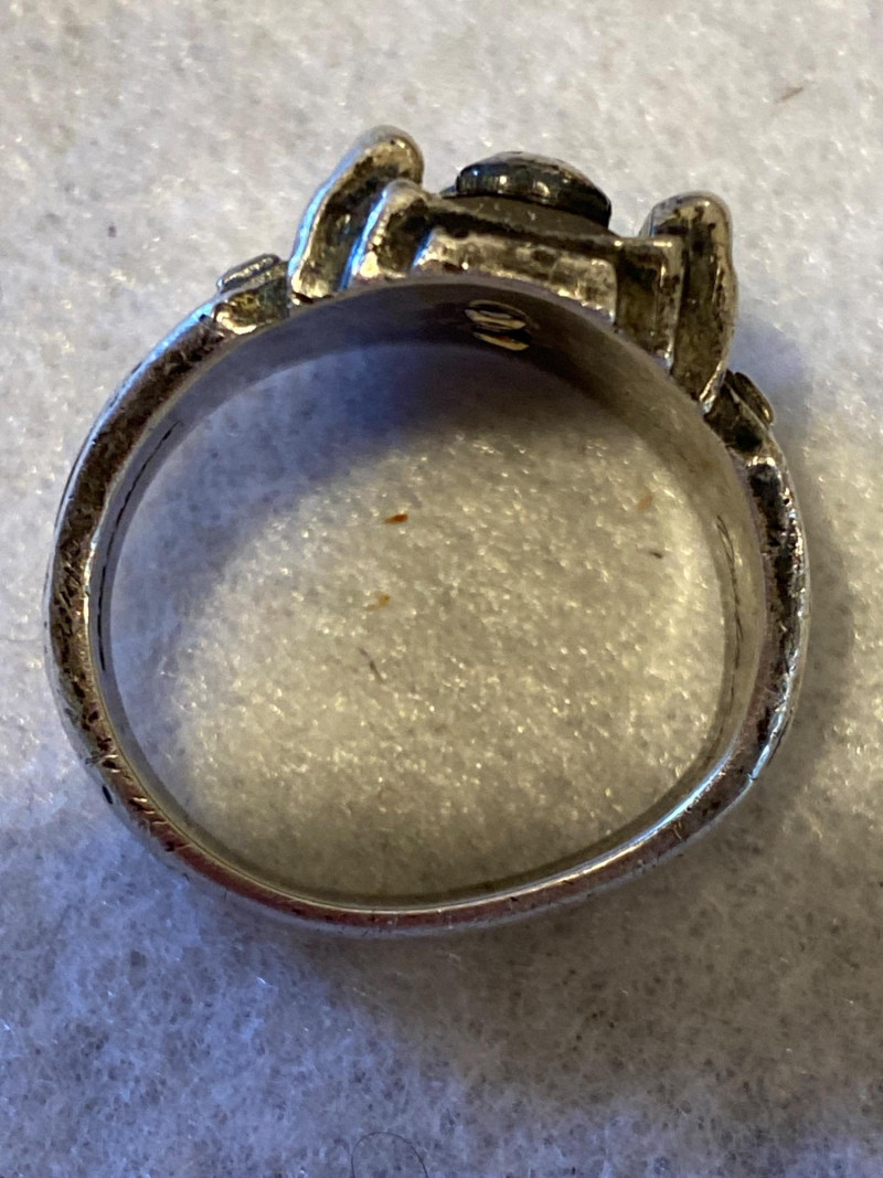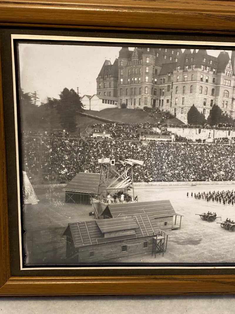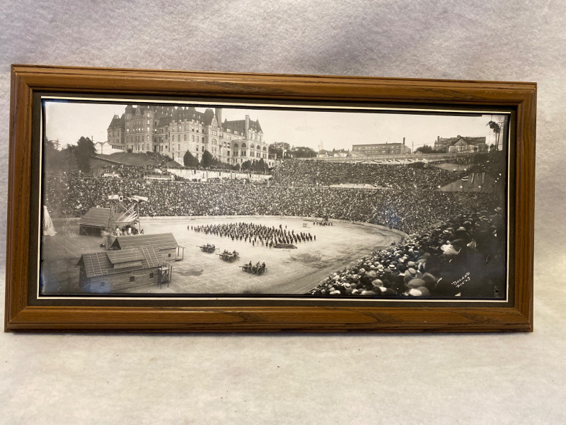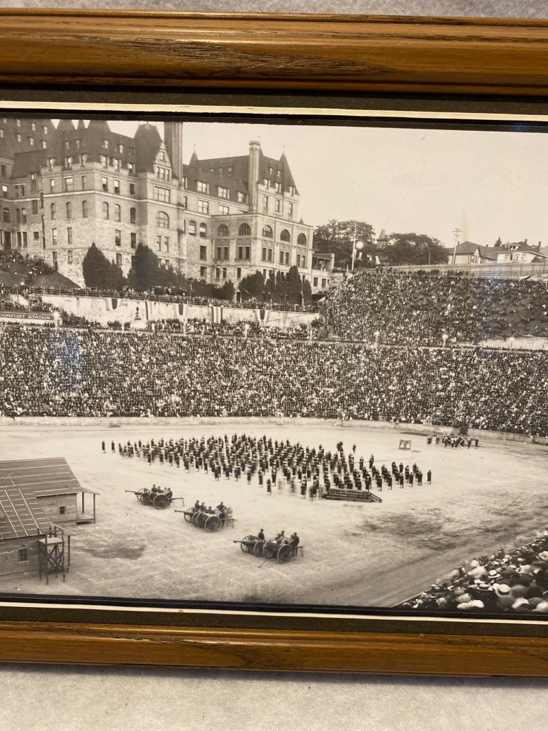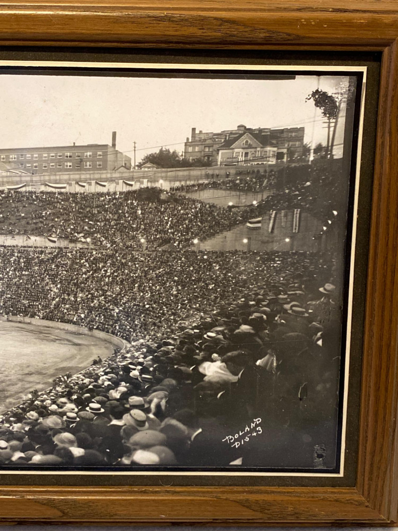 A nostalgic trio of Stadium High School keepsakes. The 1926 sterling silver class ring by Josten features a red glass stone and engraved student name inside. Though slightly bent, it may size to a 9 if reshaped. Accompanying it is a 10″ blue transferware plate Photo depicting a real photo scene—likely a military celebration—framed without glass. A rare glimpse into Tacoma’s scholastic and civic pride.