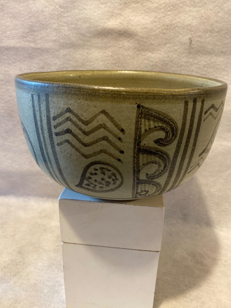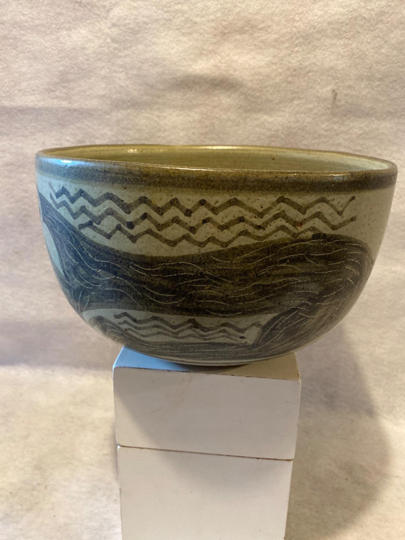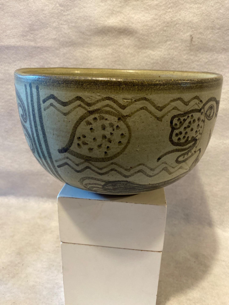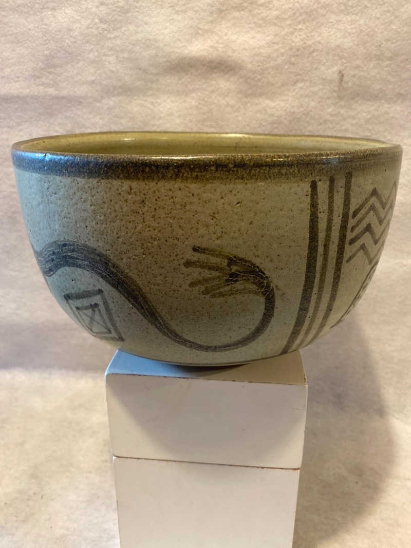 Studio Pottery Bowl with Stylized Lion – 11" Diameter × 6¼" Tall A bold ceramic vessel featuring a hand-drawn lion in stylized profile—its mane flowing like smoke, its muzzle spotted, its eye wide with ancient wisdom or mild surprise. Zigzag motifs frame the beast like thunderclouds or tribal banners, while the earthy glaze of browns and grays lends the piece a primal, grounded elegance. Diameter: 11 inches Height: 6¼ inches Condition: Small sediment line near the bottom; no known age Provenance: At one point, priced at $9.95—now priceless in personality This bowl could have served fruit, held secrets, or simply roared from a shelf. Today, it’s a conversation piece for collectors of studio pottery, animal iconography, or midcentury mystique.