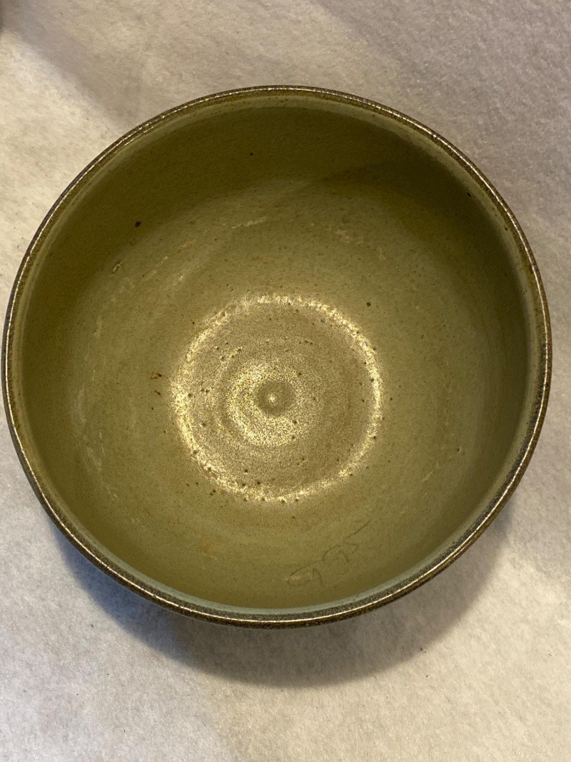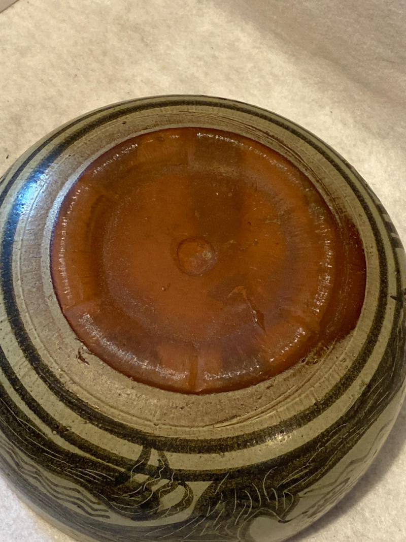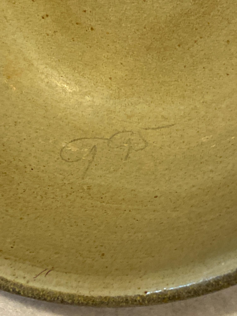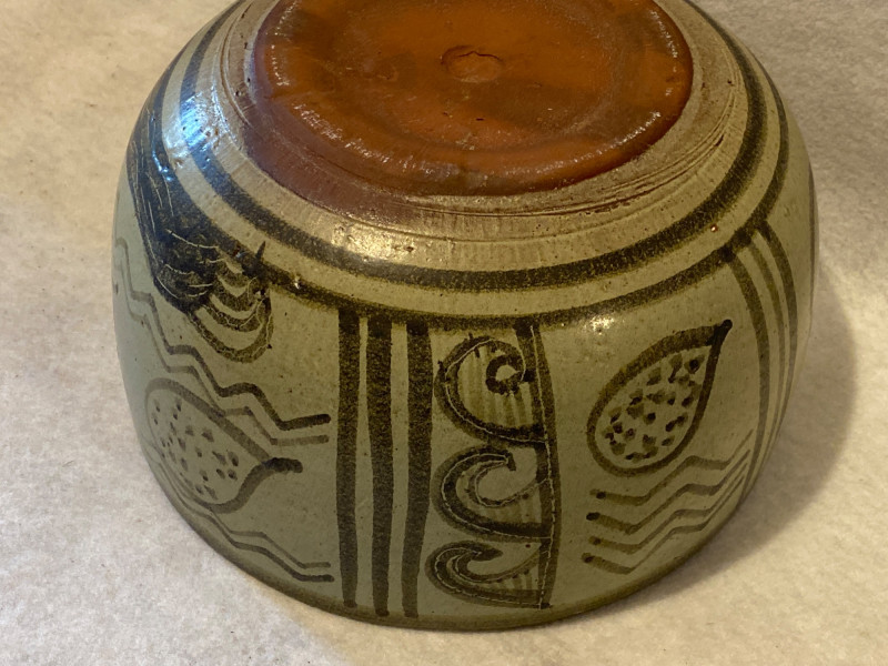 Studio Pottery Bowl with Stylized Lion – 11" Diameter × 6¼" Tall A bold ceramic vessel featuring a hand-drawn lion in stylized profile—its mane flowing like smoke, its muzzle spotted, its eye wide with ancient wisdom or mild surprise. Zigzag motifs frame the beast like thunderclouds or tribal banners, while the earthy glaze of browns and grays lends the piece a primal, grounded elegance. Diameter: 11 inches Height: 6¼ inches Condition: Small sediment line near the bottom; no known age Provenance: At one point, priced at $9.95—now priceless in personality This bowl could have served fruit, held secrets, or simply roared from a shelf. Today, it’s a conversation piece for collectors of studio pottery, animal iconography, or midcentury mystique.