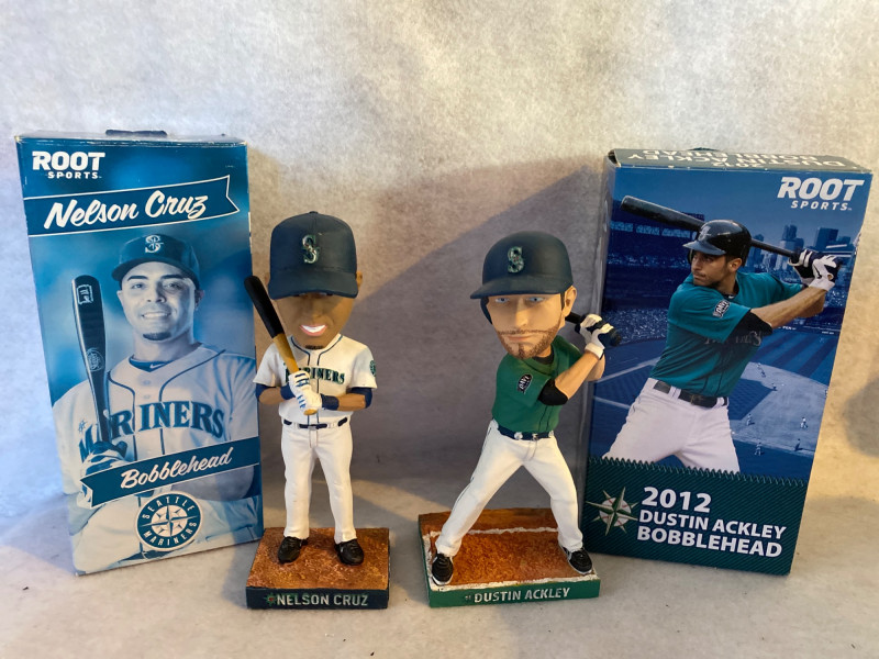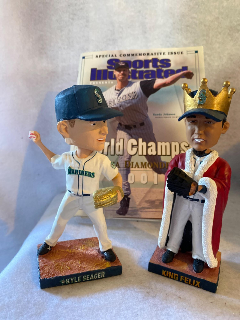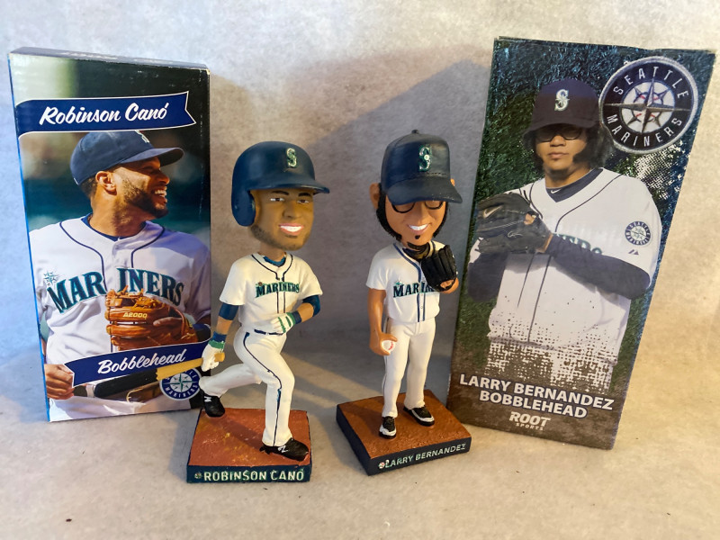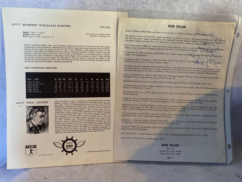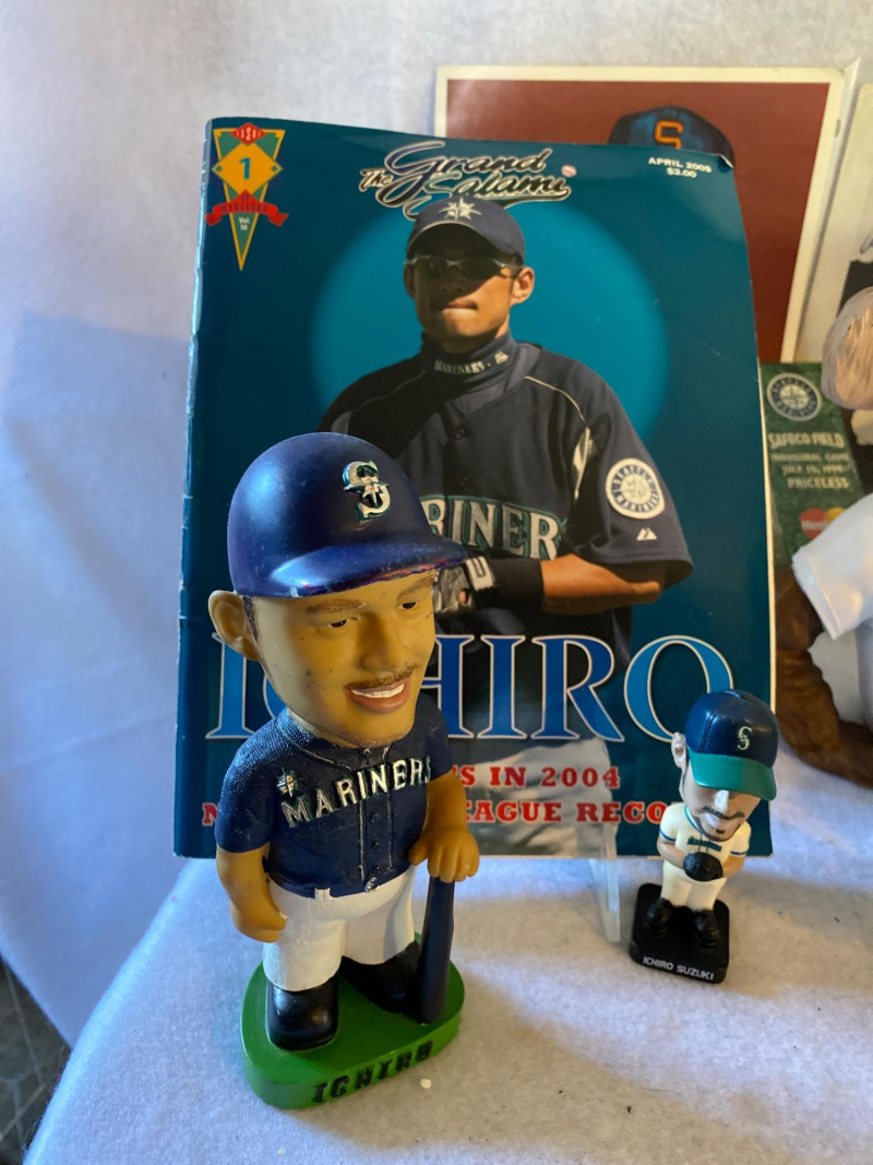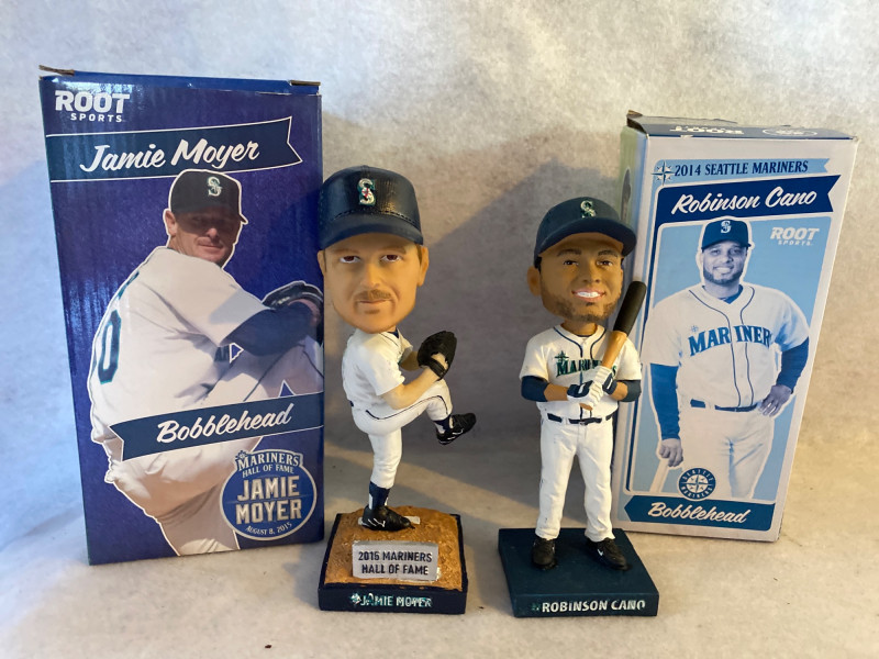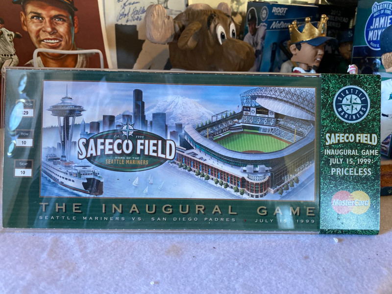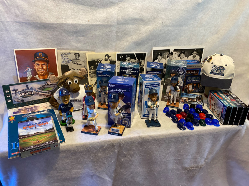 Baseball Bobble Heads, Mariner Moose Bank, Bob Feller Autograph & More A sporty ensemble of memorabilia for the baseball buff with a taste for bobble and a nose for nostalgia: Bob Feller autograph – appears genuine, with ink bleeding through the thin paper (a classic sign of authenticity) Other autographs – printed, but still charming Mariner Moose bank – rare and in like-new condition Inaugural day ticket – complete and ready for framing or storytelling This lot is a dugout of delight, perfect for collectors of Pacific Northwest sports ephemera, bobblehead enthusiasts, or anyone who appreciates the quirky corners of baseball history.