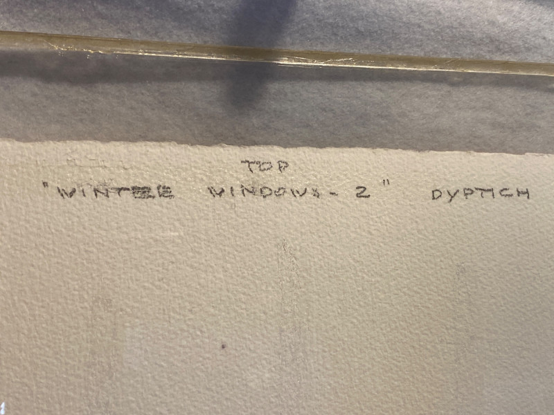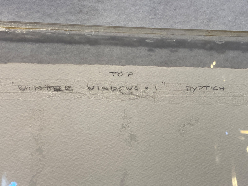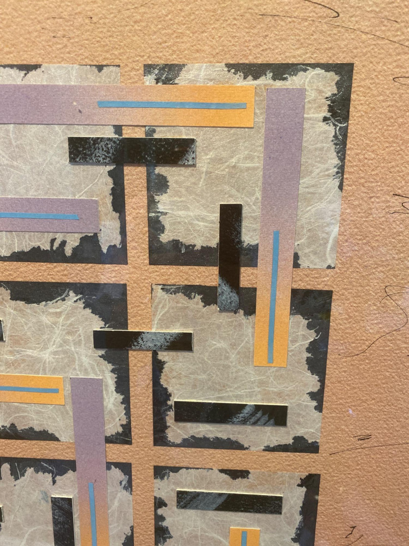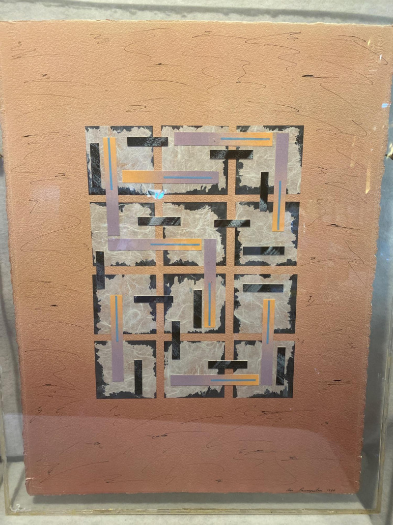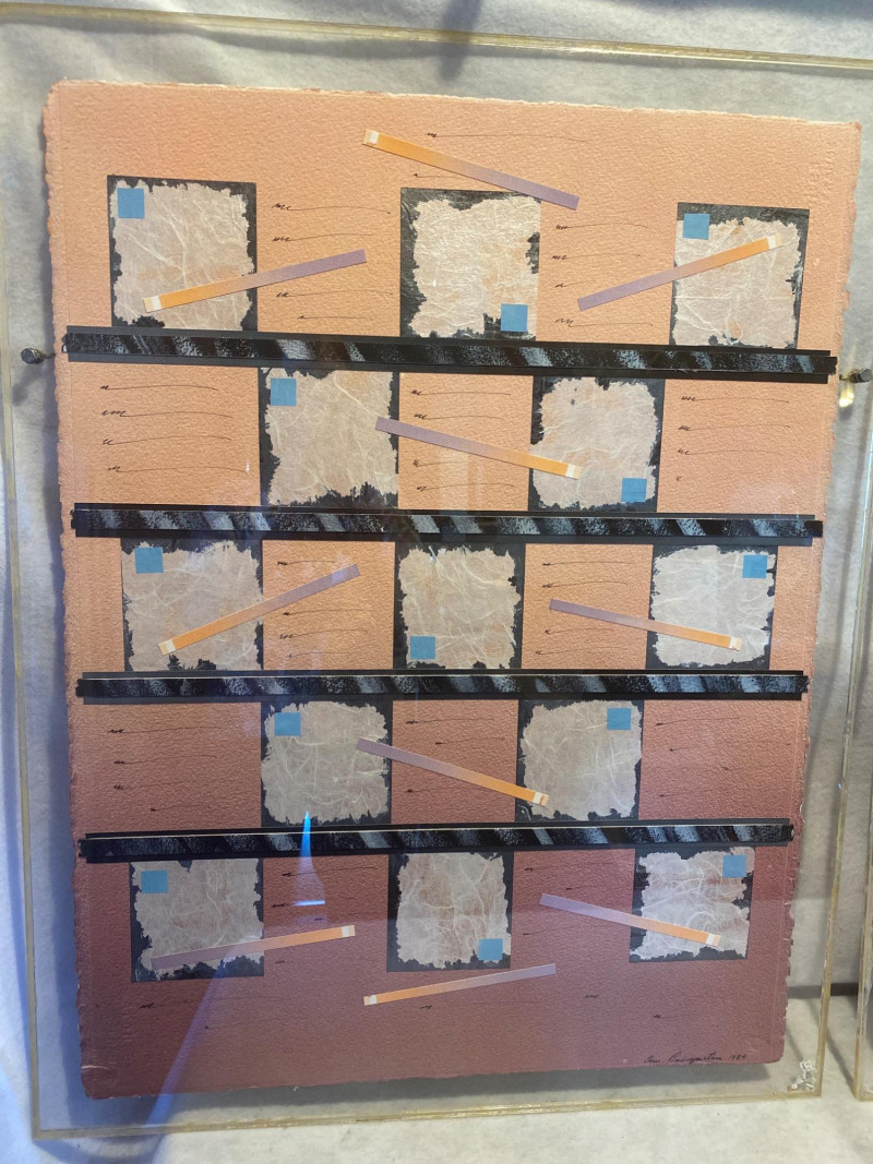 A vibrant pair of mixed-media collages by artist Chris Baumgartner, each piece layered with color, texture, and expressive composition. Sandwiched between two sheets of plexiglass, these works radiate far more brightness and depth than the photos suggest—like stained glass for the modern wall.