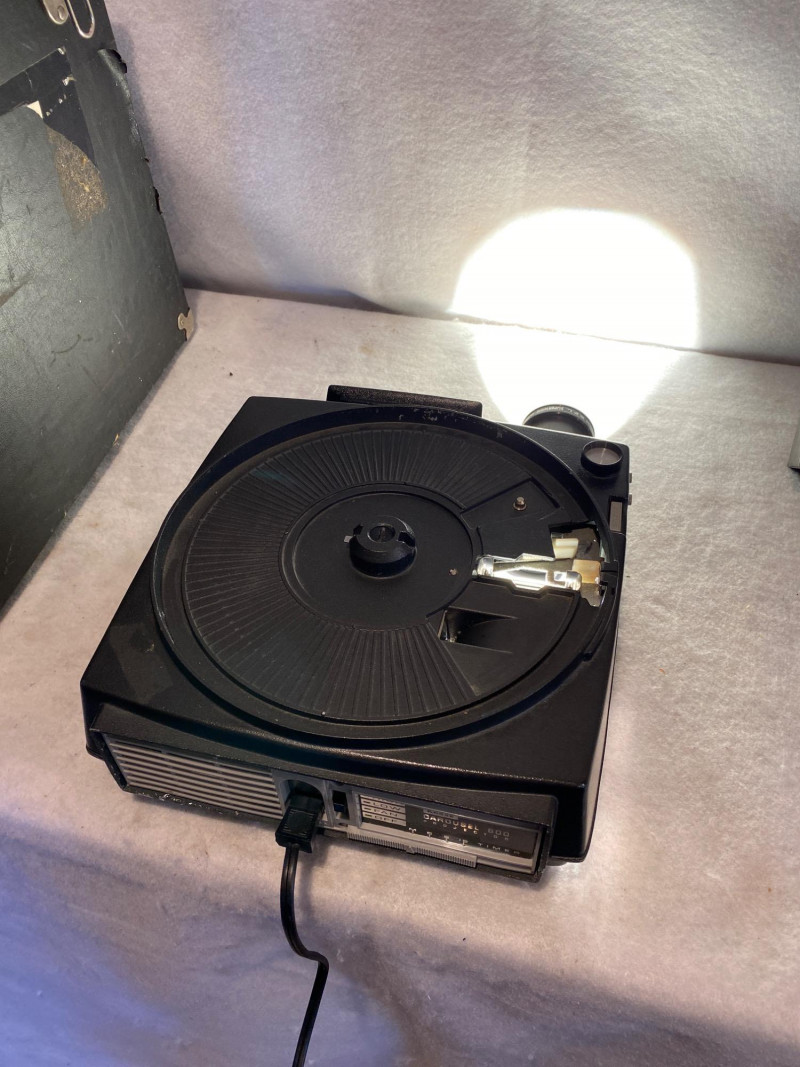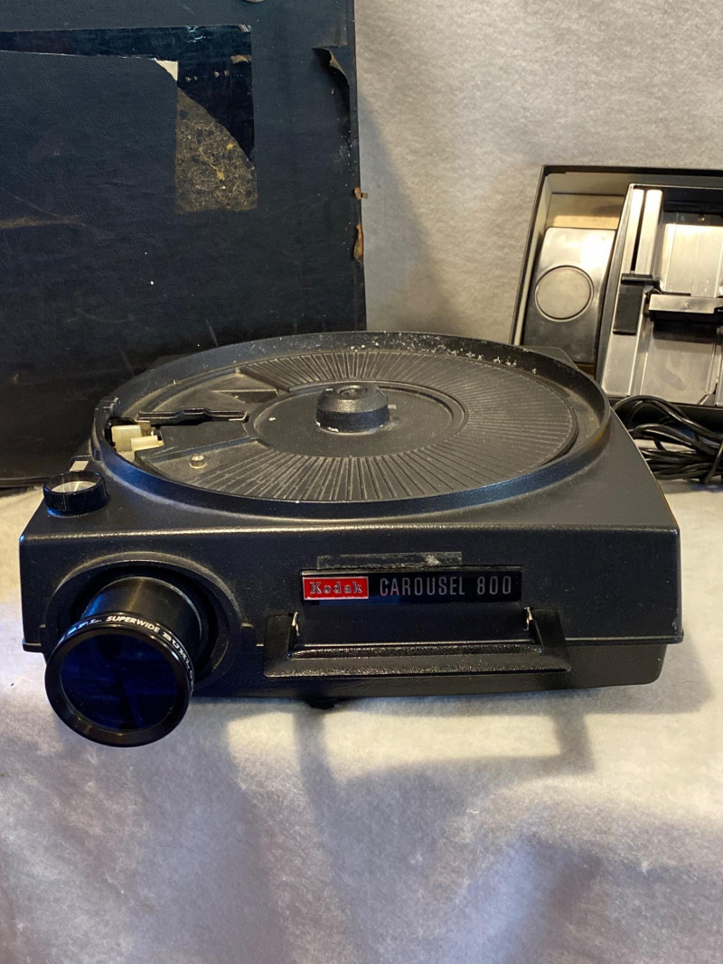 A classic Kodak Carousel 800 slide projector, complete with its original sturdy carry case and working components. The fan, light, and remote plug-in control have all been tested and confirmed functional—ready to cast your memories in warm analog glow. Perfect for vintage tech collectors, analog romantics, or anyone ready to relive the golden age of family slideshows.